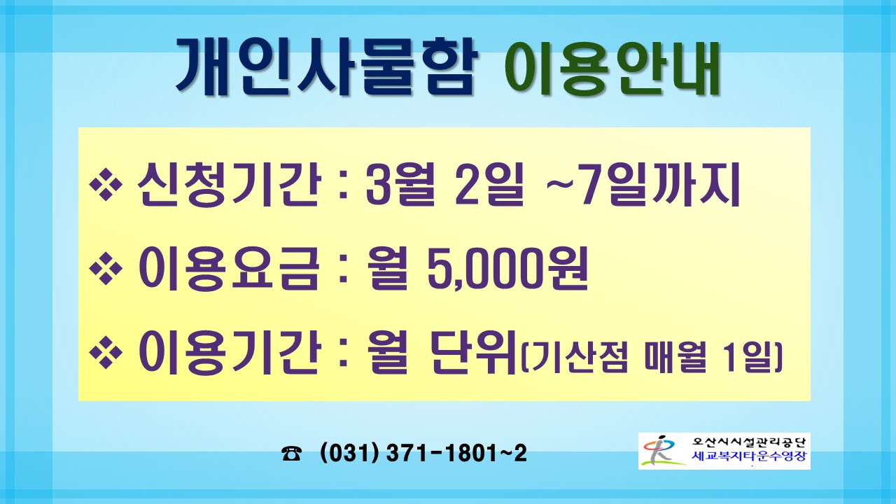 세교복지타운 수영장 3월 개인사물함 이용안내 작성자 세교센터관리자 등록일자 2019년 2월 27일 10시 18분 34초 조회 260 개인사물함 이용안내.jpg [ Size : 129.75KB , Down : 134 ] 미리보기 다운로드 목록보기