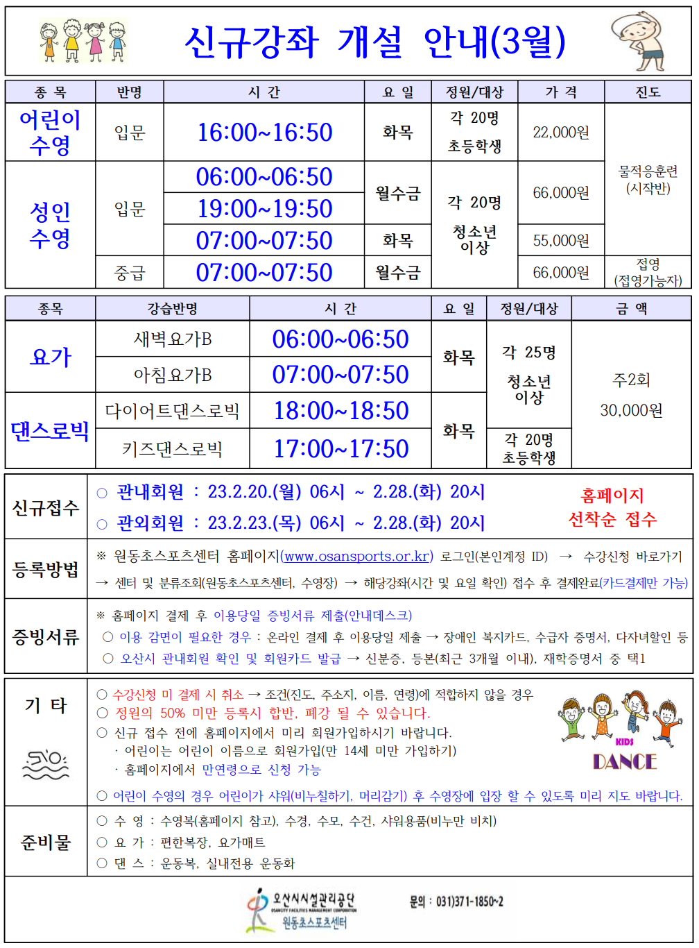 원동초 스포츠센터 3월 신규강좌 개설 안내 작성자 osansisul02 등록일자 2023년 2월 13일 16시 14분 1초 조회 1,047 신규강좌개설 안내(3월).png [ Size : 399.74KB , Down : 1,699 ] 미리보기 다운로드 목록보기