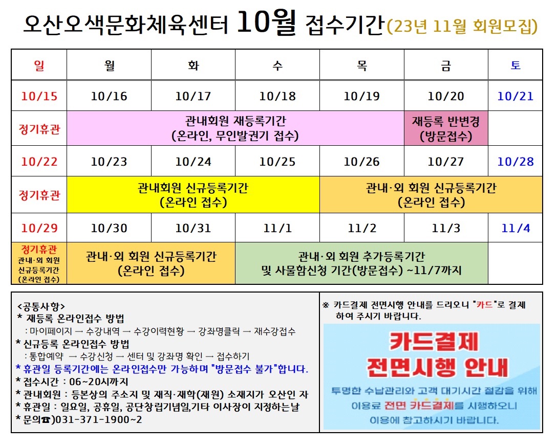 오색문화체육센터 오산오색문화체육센터 10월 접수기간(2023. 11월 강좌) 작성자 osansisul04 등록일자 2023년 10월 10일 10시 16분 17초 조회 589 . 2023.10월접수기간(11월 강좌).jpg [ Size : 297.7KB , Down : 1,099 ] 미리보기 다운로드 목록보기