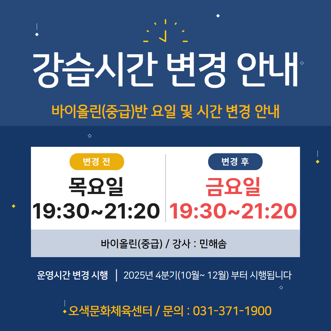 공지 오색문화체육센터 [오색문화체육센터] 바이올린(중급) 강습시간 변경 작성자 osansisul04 등록일자 2025년 9월 19일 9시 25분 1초 조회 444 제목을 입력하세요 (15).jpg [ Size : 399.54KB , Down : 421 ] 미리보기 다운로드 목록보기