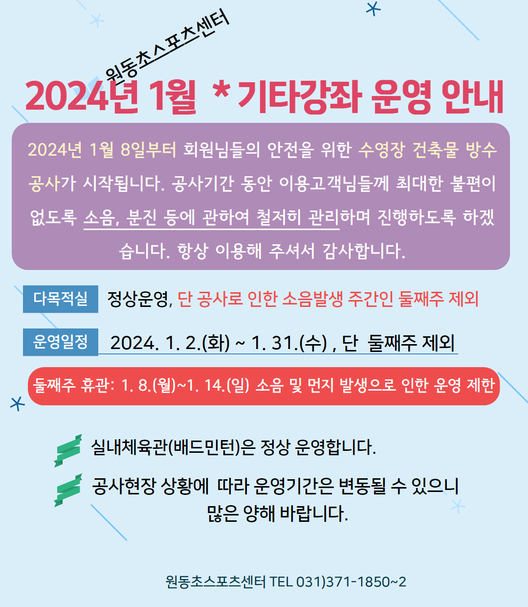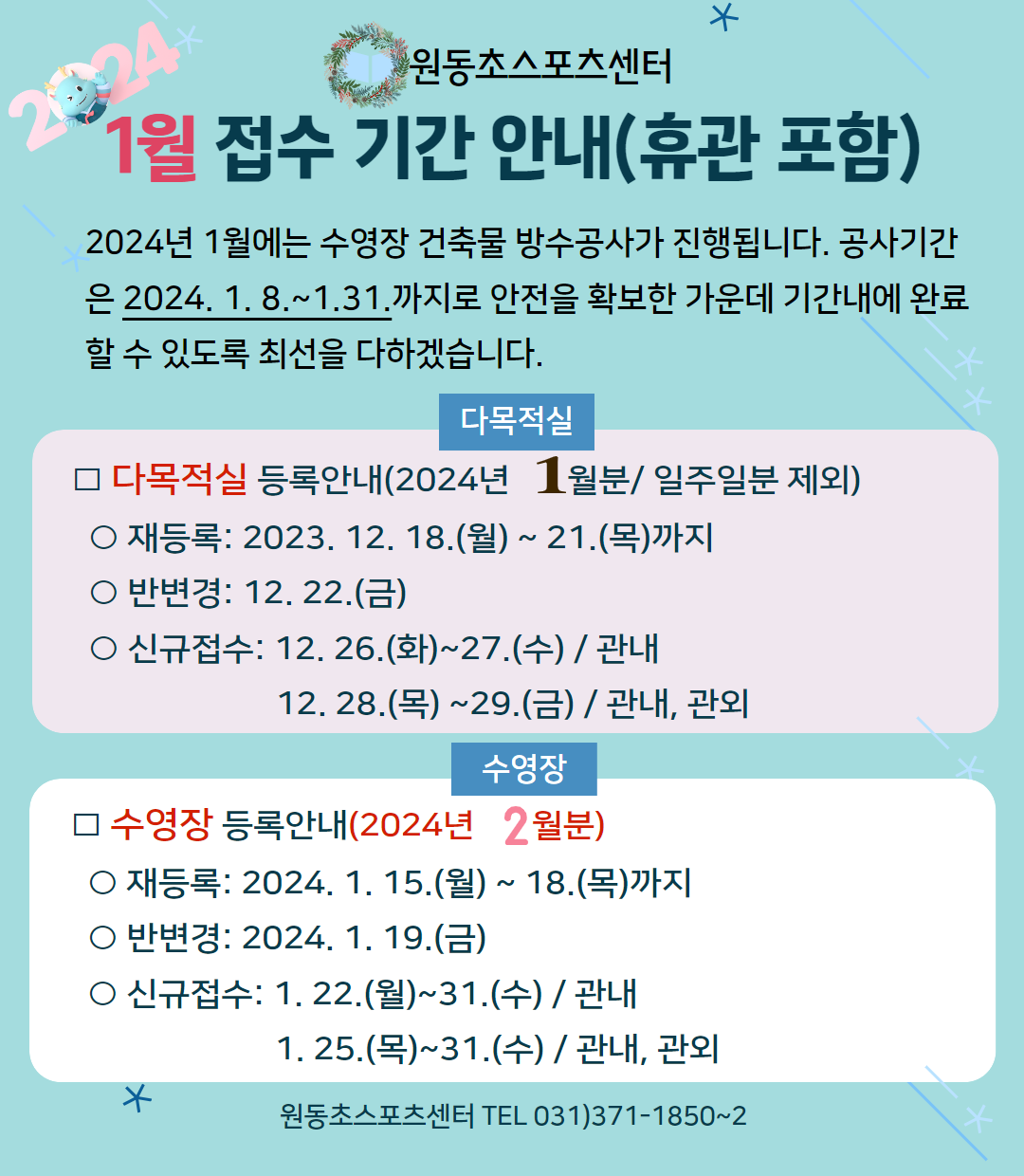 원동초 스포츠센터 2024년 1월 접수기간 안내(기타강좌, 수영장) _운영일정 변경 포함 작성자 osansisul02 등록일자 2023년 12월 12일 8시 31분 58초 조회 1,379 2024년 1월 접수기간 안내(기타강좌, 수영장).png [ Size : 156.18KB , Down : 2,382 ] 미리보기 다운로드 2021년 1월 기타강좌 운영안내.png [ Size : 127.41KB , Down : 2,351 ] 미리보기 다운로드 수영장 휴장안내.png [ Size : 136.19KB , Down : 2,323 ] 미리보기 다운로드 목록보기