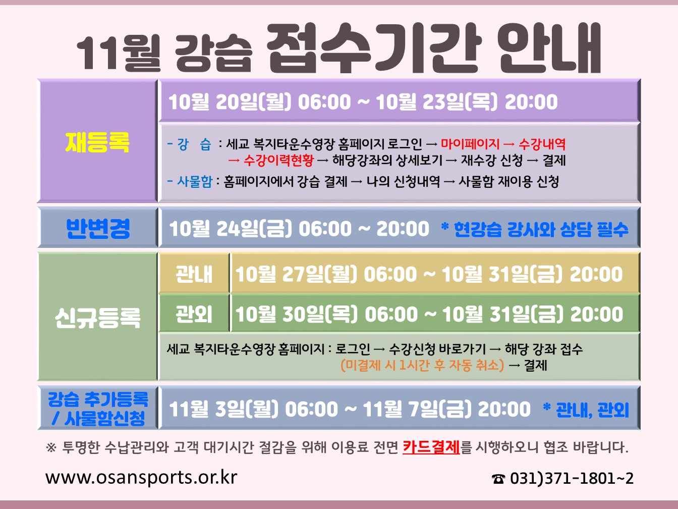 세교복지타운 수영장 [세교] 11월 강습 접수기간 안내 작성자 osansisul01 등록일자 2025년 10월 10일 5시 51분 53초 조회 773 25년 11월 강습 접수기간 안내.jpg [ Size : 248.6KB , Down : 1,049 ] 미리보기 다운로드 목록보기
