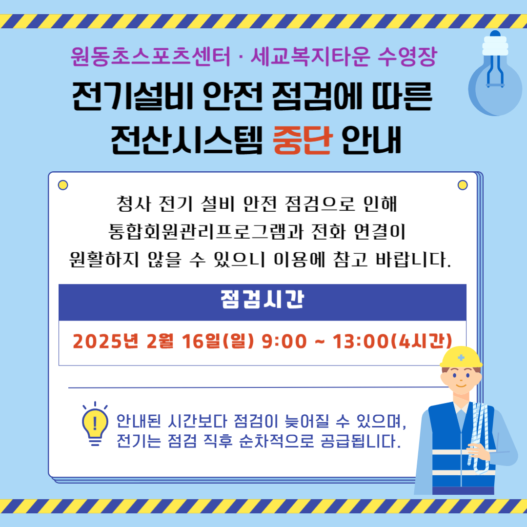 세교복지타운 수영장 [원동,세교] 2월 16일(일) 전기설비 안전 점검에 따른 전산시스템 중단 안내 작성자 osansisul01 등록일자 2025년 2월 11일 15시 43분 51초 조회 539 정전안내-001.jpg [ Size : 530.99KB , Down : 667 ] 미리보기 다운로드 목록보기