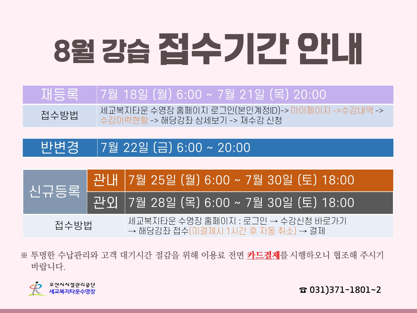 세교복지타운 수영장 8월 접수기간 안내 작성자 osansisul01 등록일자 2022년 7월 15일 16시 5분 8초 조회 826 22.8월 접수기간 안내.jpg [ Size : 200.58KB , Down : 1,195 ] 미리보기 다운로드 목록보기
