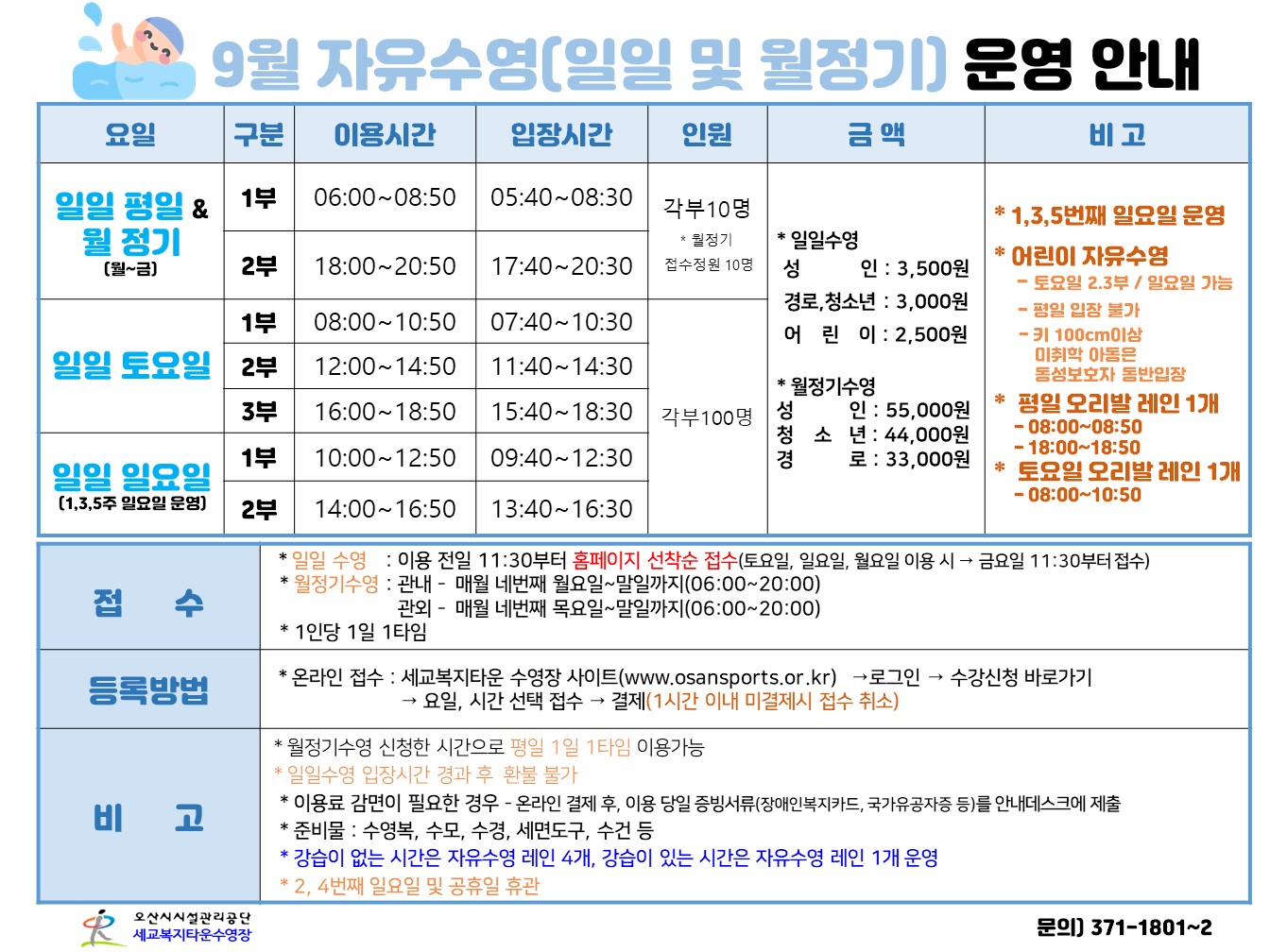 세교복지타운 수영장 9월 자유수영 안내(일일 및 월정기) 작성자 osansisul01 등록일자 2022년 8월 11일 14시 46분 2초 조회 566 9월 일일및 월정기 자유수영.jpg [ Size : 322.93KB , Down : 288 ] 미리보기 다운로드 목록보기