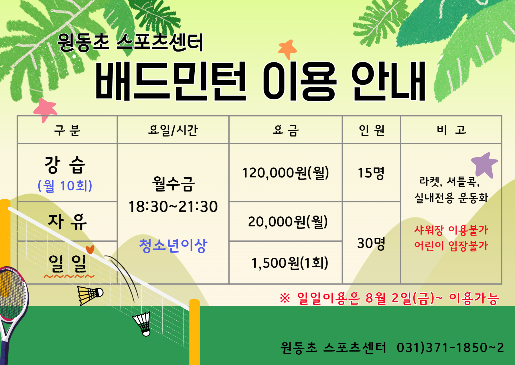 원동초 스포츠센터 [원동] 배드민턴 이용 안내 작성자 osansisul02 등록일자 2024년 7월 22일 16시 14분 54초 조회 722 민턴.jpg [ Size : 1.36MB , Down : 521 ] 미리보기 다운로드 목록보기