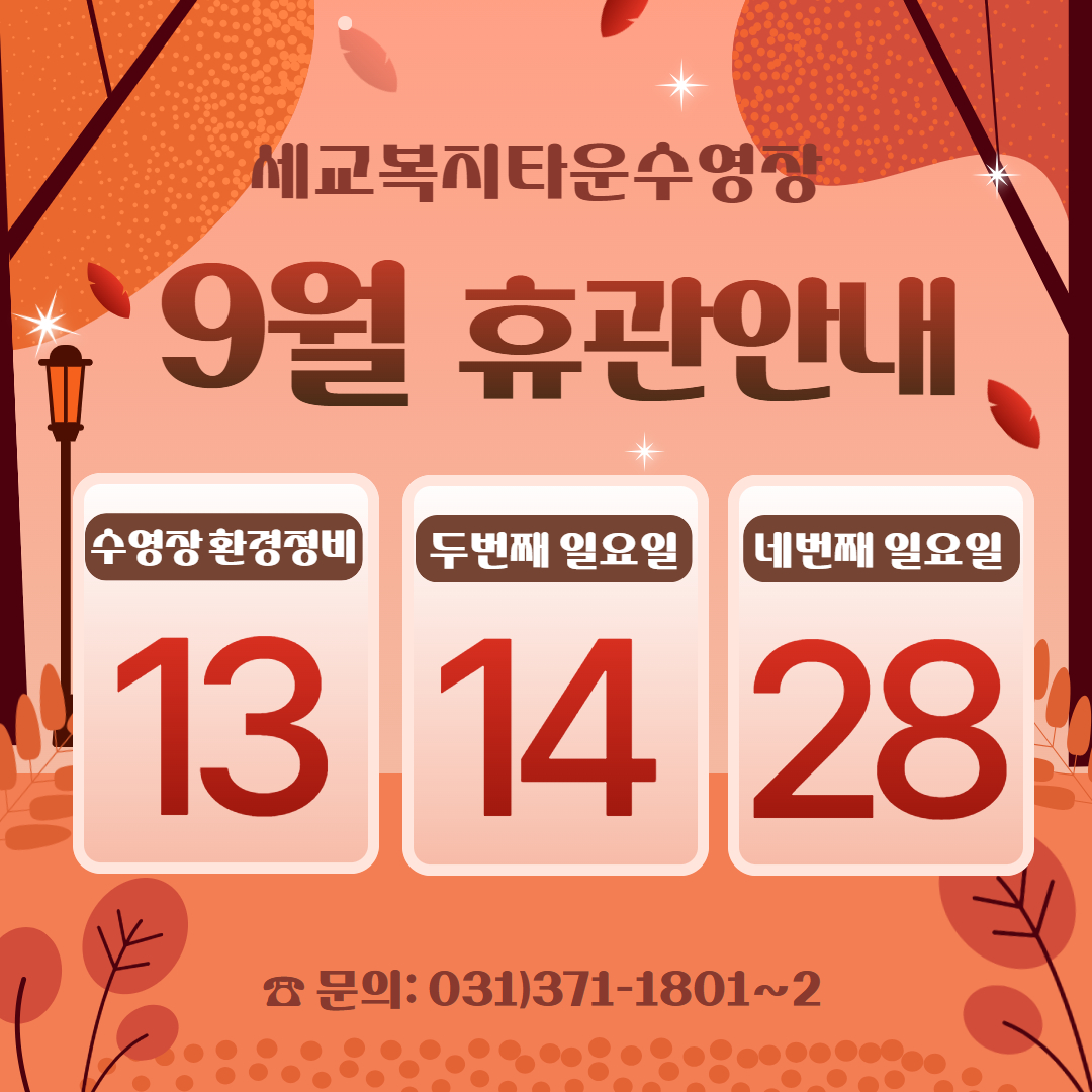 세교복지타운 수영장 [세교] 9월 휴관일 안내 작성자 osansisul01 등록일자 2025년 9월 2일 11시 2분 35초 조회 337 9월 휴관일(환경정비 추가).jpg [ Size : 703.21KB , Down : 354 ] 미리보기 다운로드 목록보기