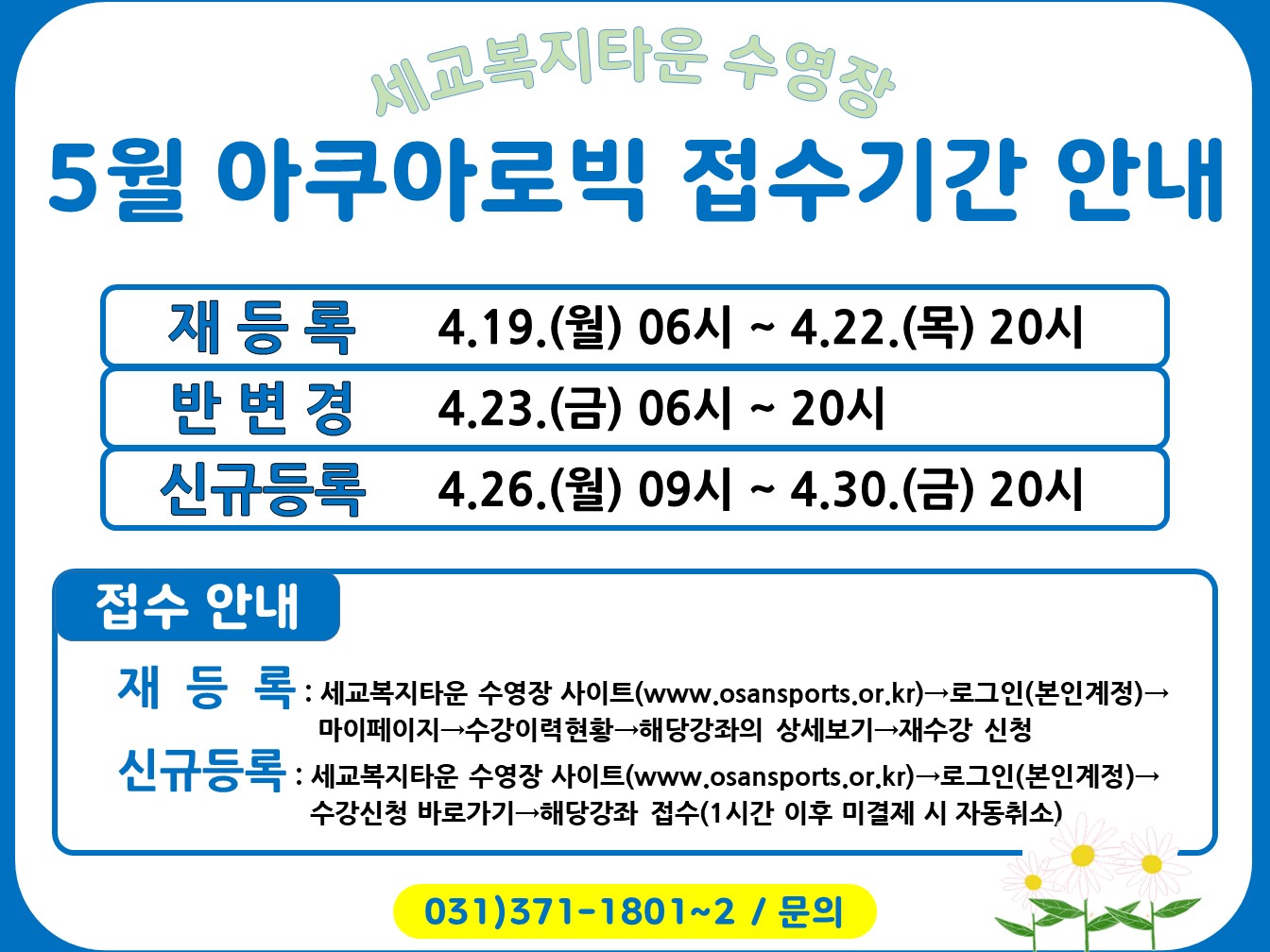 세교복지타운 수영장 5월 아쿠아로빅 접수기간 안내 작성자 세교센터관리자 등록일자 2021년 4월 14일 9시 54분 15초 조회 323 5월 강좌 접수 안내.jpg [ Size : 267.37KB , Down : 151 ] 미리보기 다운로드 목록보기