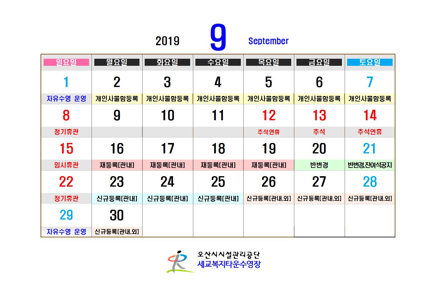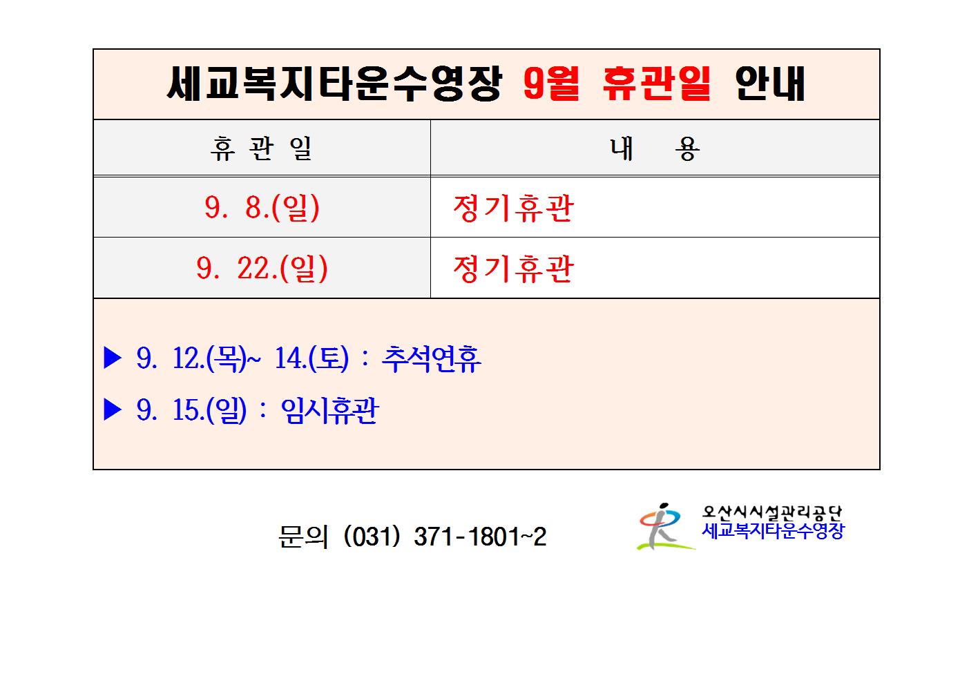 세교복지타운 수영장 9월 휴관일 안내 작성자 세교센터관리자 등록일자 2019년 8월 28일 17시 30분 59초 조회 858 9월달력.세교복지타운 수영장 휴관일 안내001.jpg [ Size : 131.41KB , Down : 135 ] 미리보기 다운로드 9월달력.세교복지타운 수영장 휴관일 안내002.jpg [ Size : 99.92KB , Down : 127 ] 미리보기 다운로드 목록보기