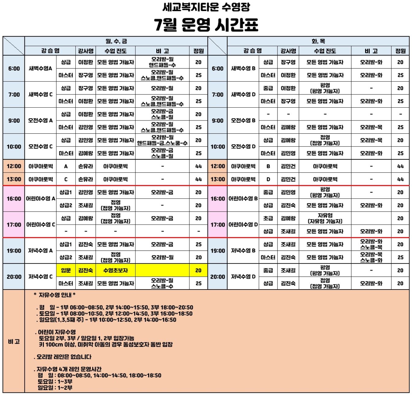 세교복지타운 수영장 [세교] 7월 강습진도표 작성자 osansisul01 등록일자 2024년 6월 12일 15시 58분 24초 조회 1,020 7월 강습진도표(홈페이지-1).jpg [ Size : 308.58KB , Down : 1,683 ] 미리보기 다운로드 24.7월 수영접수안내 (홈페이지).jpg [ Size : 253.07KB , Down : 1,536 ] 미리보기 다운로드 목록보기