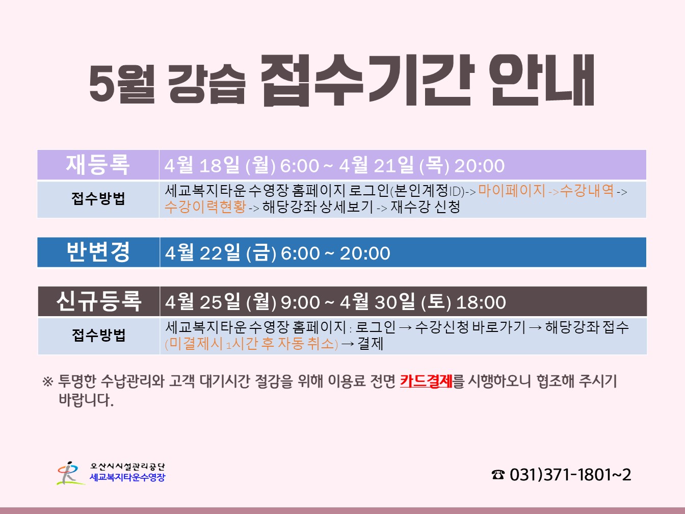 세교복지타운 수영장 5월 접수기간 안내 작성자 osansisul01 등록일자 2022년 4월 18일 12시 27분 4초 조회 1,025 22.5월 접수기간 안내.jpg [ Size : 178.1KB , Down : 344 ] 미리보기 다운로드 목록보기