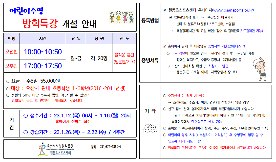 원동초 스포츠센터 어린이 수영 방학특강 개설 안내 작성자 osansisul02 등록일자 2023년 1월 5일 12시 51분 11초 조회 353 방학특강.png [ Size : 108.32KB , Down : 501 ] 미리보기 다운로드 목록보기
