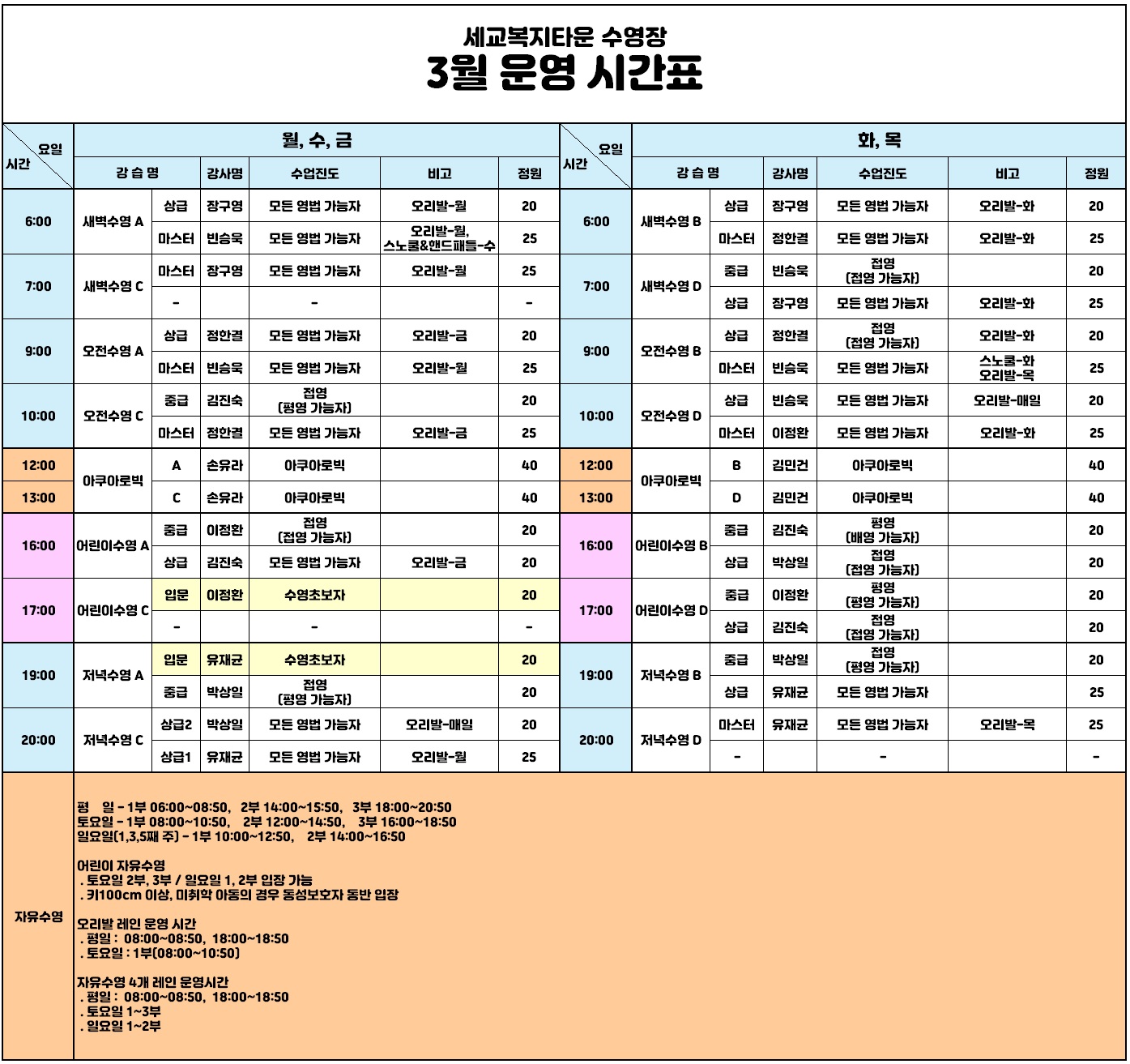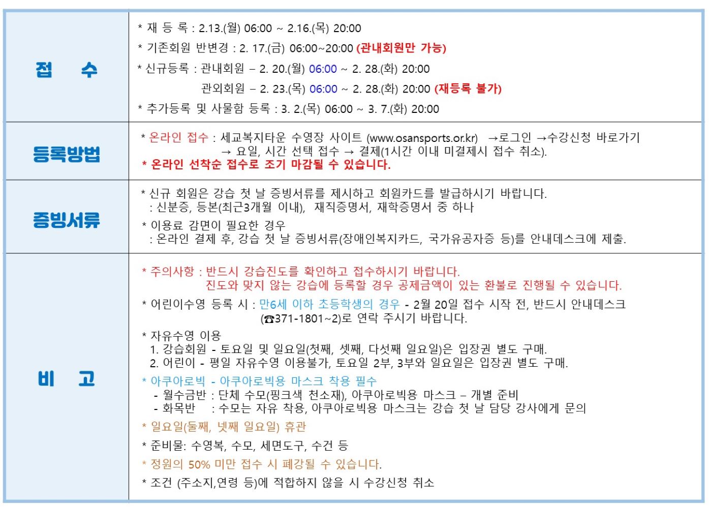 세교복지타운 수영장 3월 수영 강습 운영 시간표(강습진도표 포함) 작성자 osansisul01 등록일자 2023년 2월 17일 11시 5분 49초 조회 863 3월 운영시간표.jpg [ Size : 435.56KB , Down : 1,506 ] 미리보기 다운로드 23년 3월 수영 접수 안내.jpg [ Size : 199.59KB , Down : 1,421 ] 미리보기 다운로드 목록보기