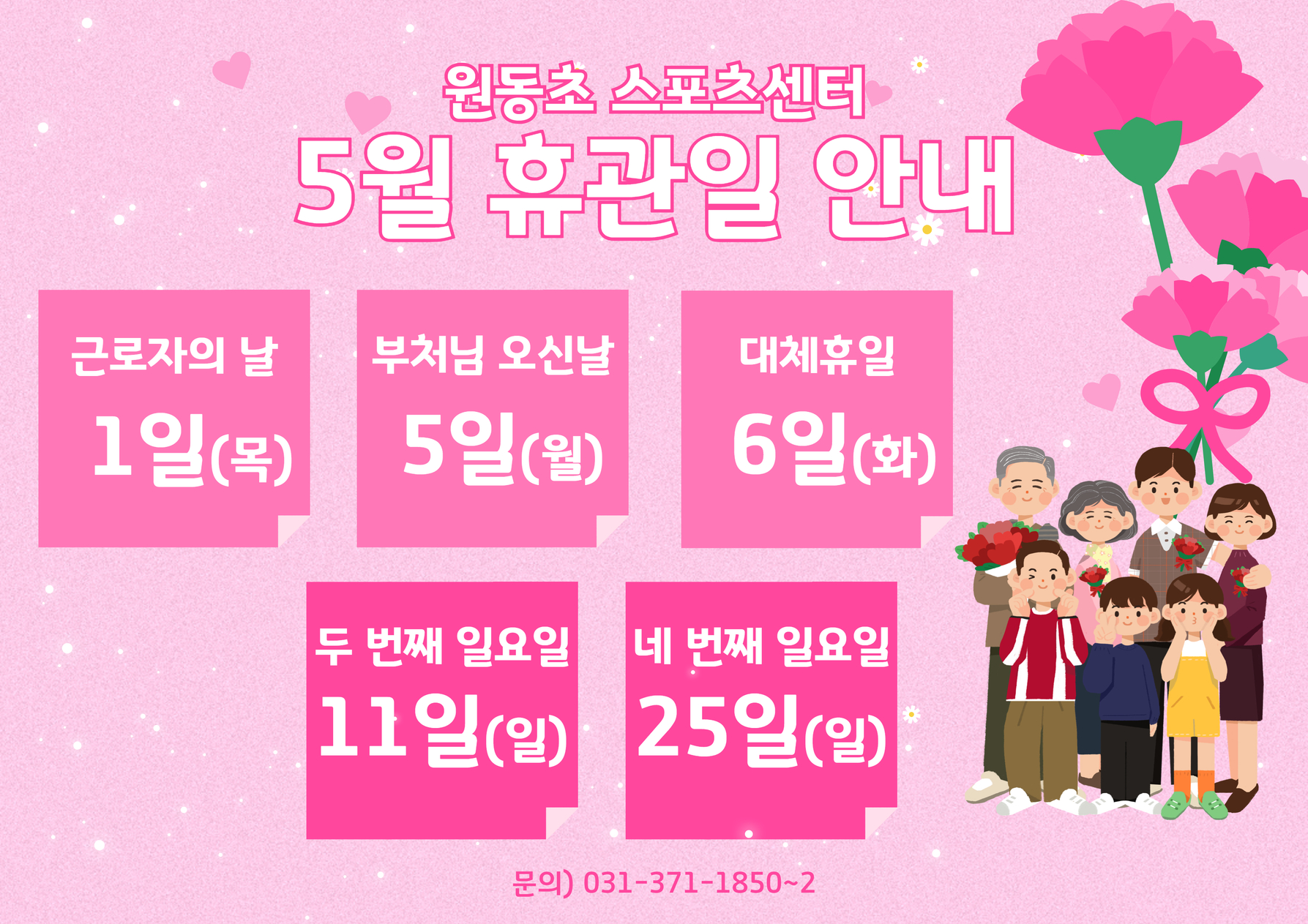 원동초 스포츠센터 [원동] 원동초스포츠센터 2025년 5월 휴관 안내 작성자 osansisul02 등록일자 2025년 4월 25일 14시 51분 59초 조회 1,441 5월_휴관일안내_원동.jpg [ Size : 1.92MB , Down : 1,643 ] 미리보기 다운로드 목록보기