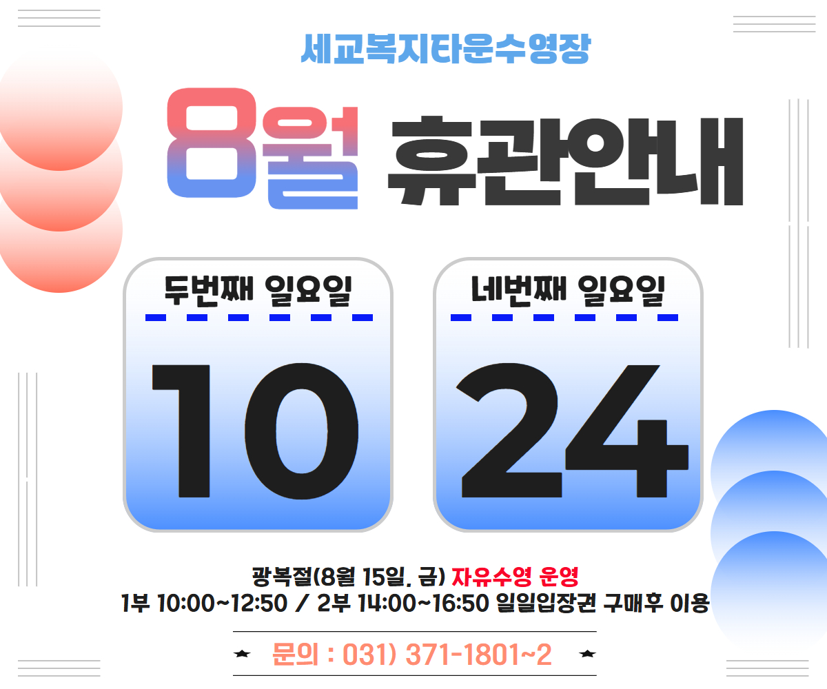 세교복지타운 수영장 [세교] 8월 휴관일 안내 작성자 osansisul01 등록일자 2025년 7월 28일 9시 27분 24초 조회 554 [세교]8월 휴관일.jpg [ Size : 472.92KB , Down : 574 ] 미리보기 다운로드 목록보기
