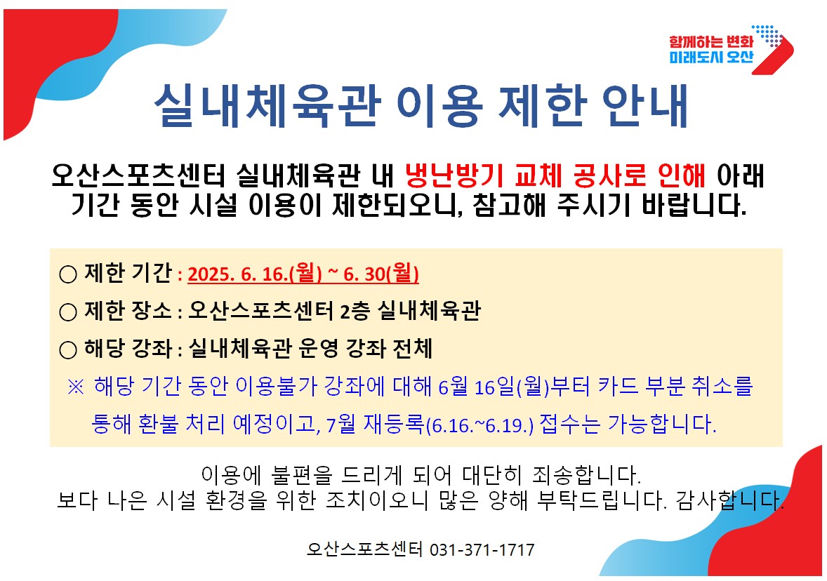 오산스포츠센터 실내체육관 냉난방기 교체 공사에 따른 6월 이용 제한 안내(6.16.(월) ~ 6.30.(월)) 작성자 osansisul03 등록일자 2025년 6월 4일 9시 29분 3초 조회 629 실내체육관 이용 제안 안내_냉난방기 교체 공사.jpg [ Size : 196.41KB , Down : 627 ] 미리보기 다운로드 목록보기