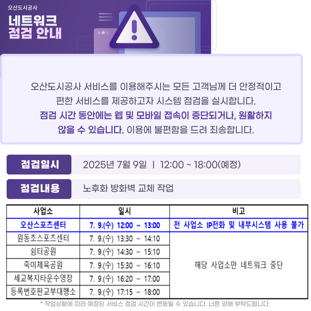 원동초 스포츠센터 방화벽 교체 작업에 따른 네트워크 중단 안내(2025.7.9.) 작성자 osansisul02 등록일자 2025년 7월 1일 11시 36분 9초 조회 270 노후화 방화벽 교체 작업에 따라 다음과 같이 네트워크가 일시 중단 될 예정이오며 해당 작업시간 내에는 인터넷, 전화 홈페이지 등이 중단되오니 이용에 참고하여 주시면 감사하겠습니다. 제목을-입력해주세요_-001.png [ Size : 255.82KB , Down : 48 ] 미리보기 다운로드 목록보기