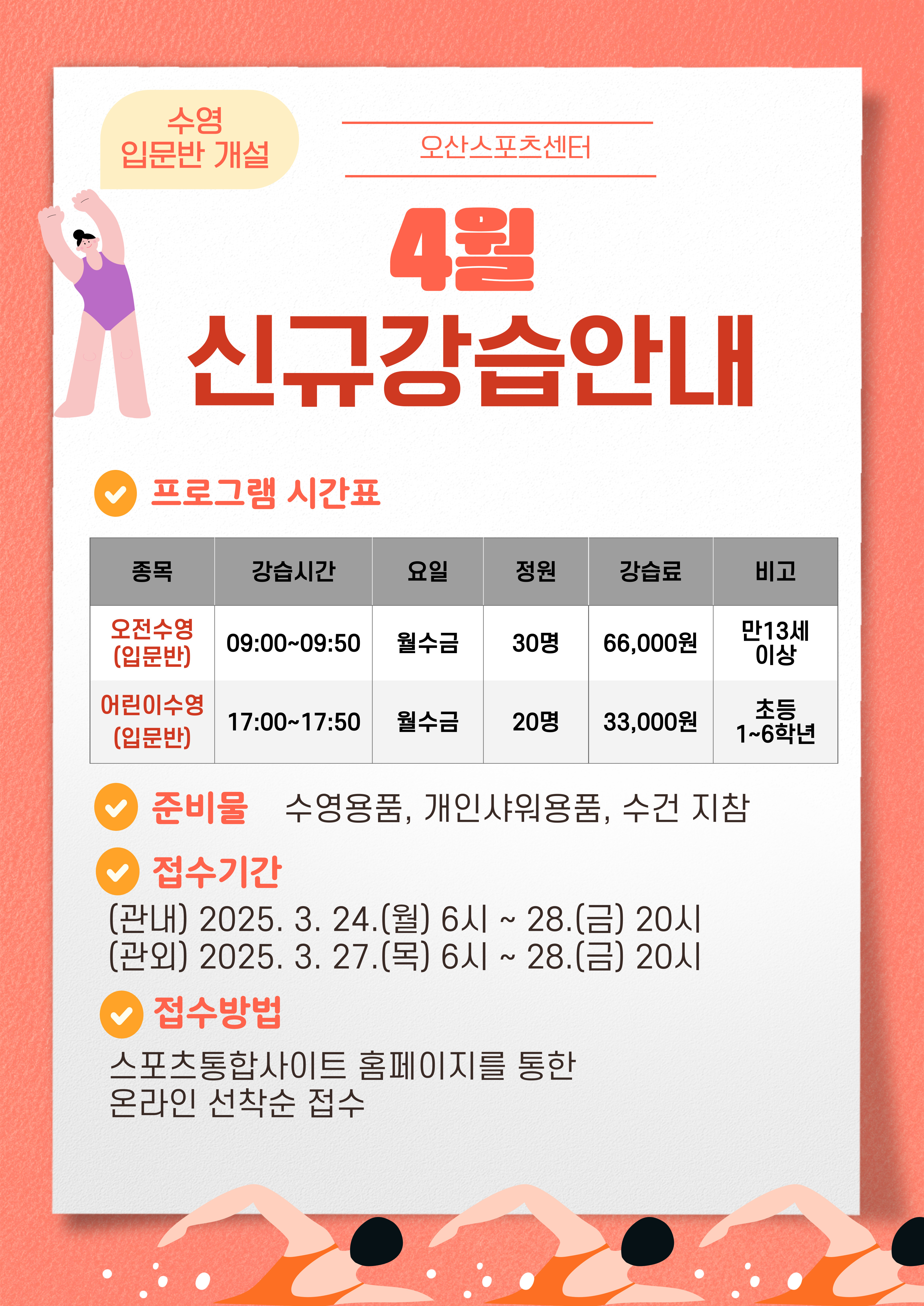 오산스포츠센터 [오산스포츠센터] 2025년 4월 수영 신규반(입문) 개설 안내 작성자 osansisul03 등록일자 2025년 3월 17일 9시 54분 46초 조회 2,854 4월-신규강좌-001 (1).jpg [ Size : 2.63MB , Down : 4,073 ] 미리보기 다운로드 목록보기
