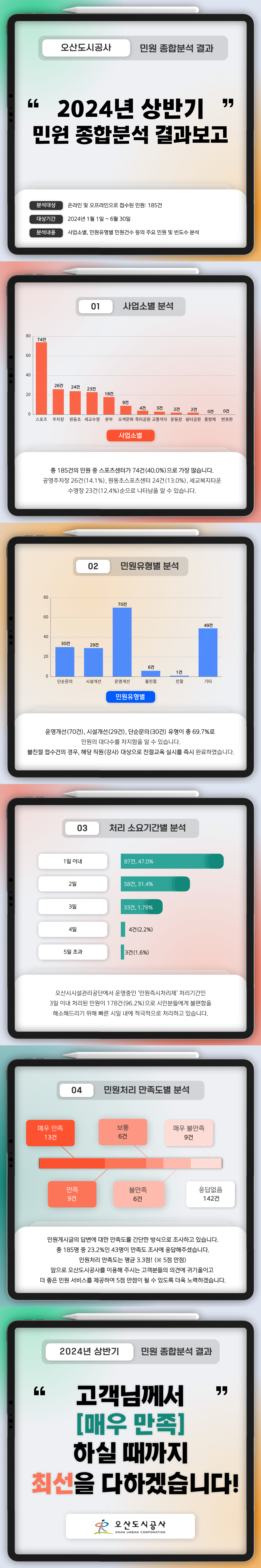 원동초 스포츠센터 2024년 오산도시공사 상반기 민원 종합분석 결과 공유 작성자 osansisul02 등록일자 2024년 8월 1일 10시 46분 24초 조회 798 2024년-상반기 민원(홈페이지).png [ Size : 1.63MB , Down : 1,038 ] 미리보기 다운로드 목록보기