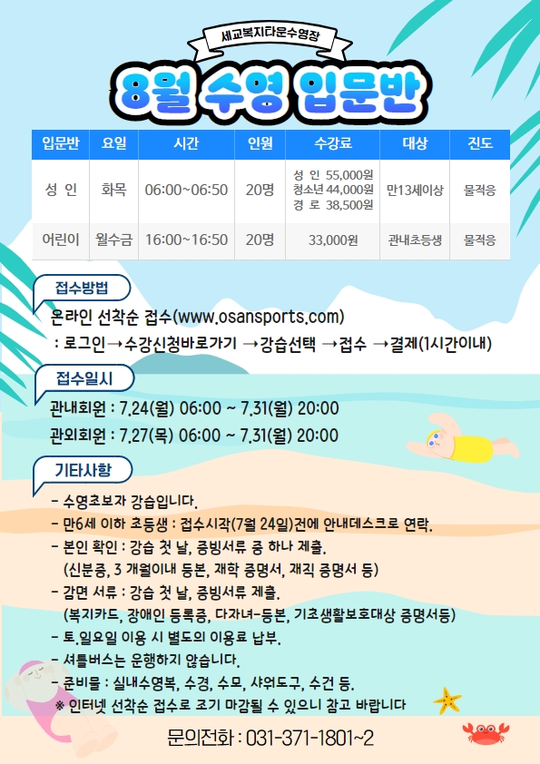 세교복지타운 수영장 8월 성인, 어린이 입문반 개설 안내 작성자 osansisul01 등록일자 2023년 7월 17일 16시 30분 10초 조회 2,691 8월 입문반(A4).jpg [ Size : 287.68KB , Down : 4,294 ] 미리보기 다운로드 목록보기