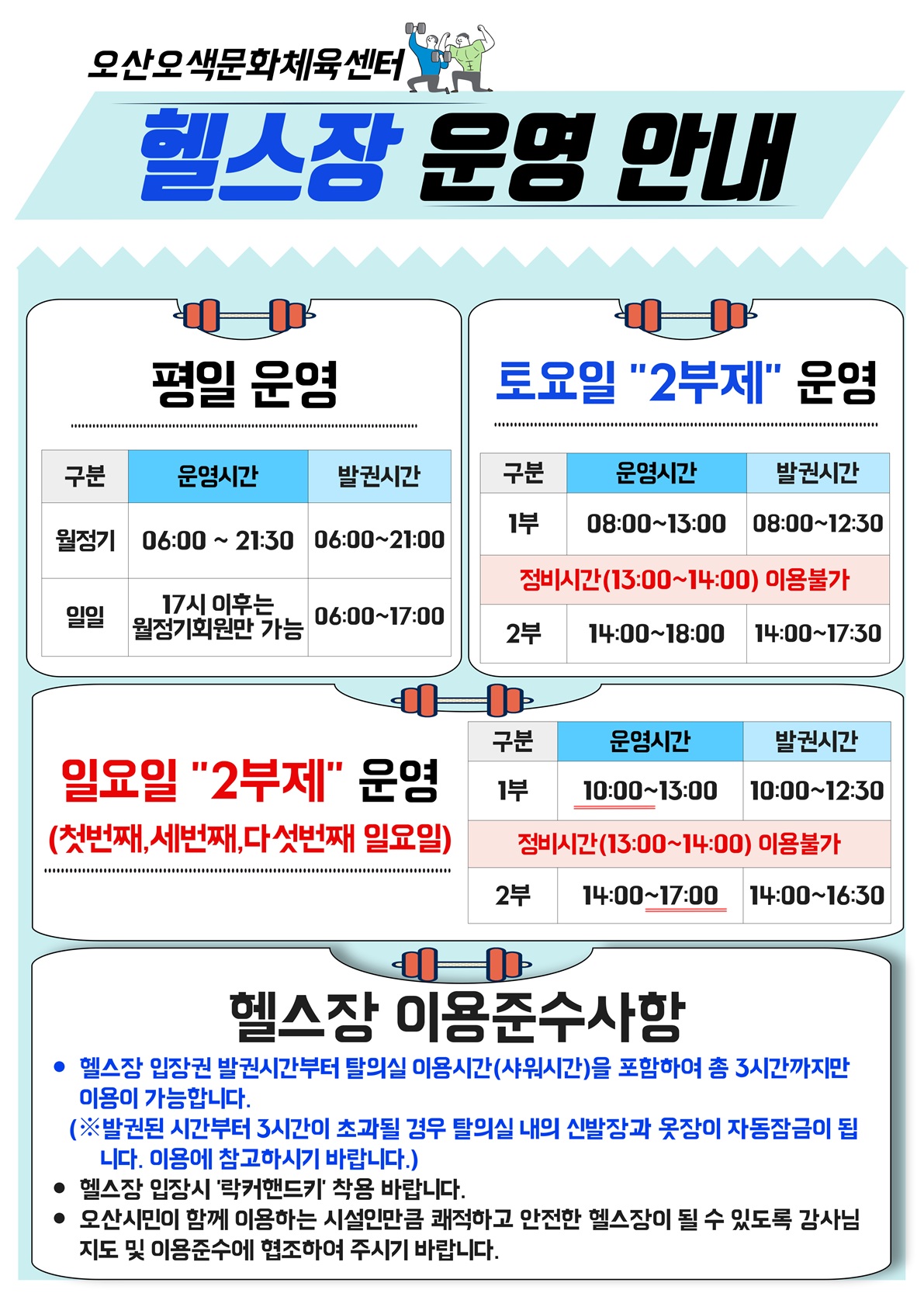 공지 오색문화체육센터 [오색문화]오색문화체육센터 운영시간 및 휴관일 안내(2025년 5월부터 적용) 작성자 osansisul04 등록일자 2025년 4월 30일 14시 30분 22초 조회 1,975 . 오색문화체육센터 5월 운영적용안내_최종_최종_최종.jpg [ Size : 1.22MB , Down : 2,187 ] 미리보기 다운로드 헬스장운영-게시물_공지사항.jpg [ Size : 485.63KB , Down : 2,124 ] 미리보기 다운로드 목록보기
