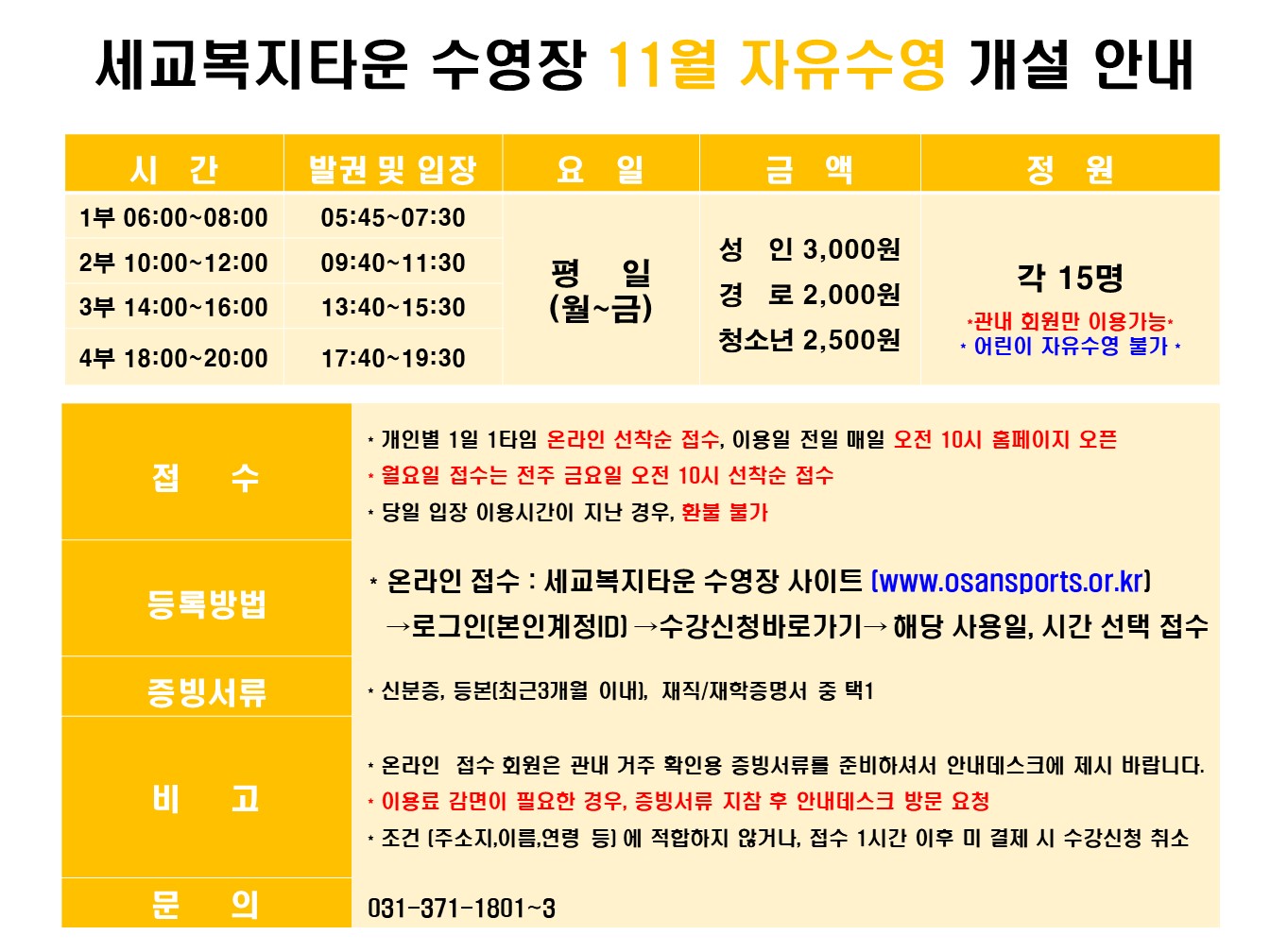 세교복지타운 수영장 11월 자유수영 안내 작성자 세교센터관리자 등록일자 2020년 10월 30일 21시 30분 19초 조회 539 11월자유수영안내.jpg [ Size : 252.17KB , Down : 172 ] 미리보기 다운로드 목록보기