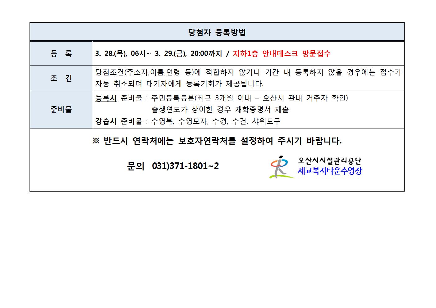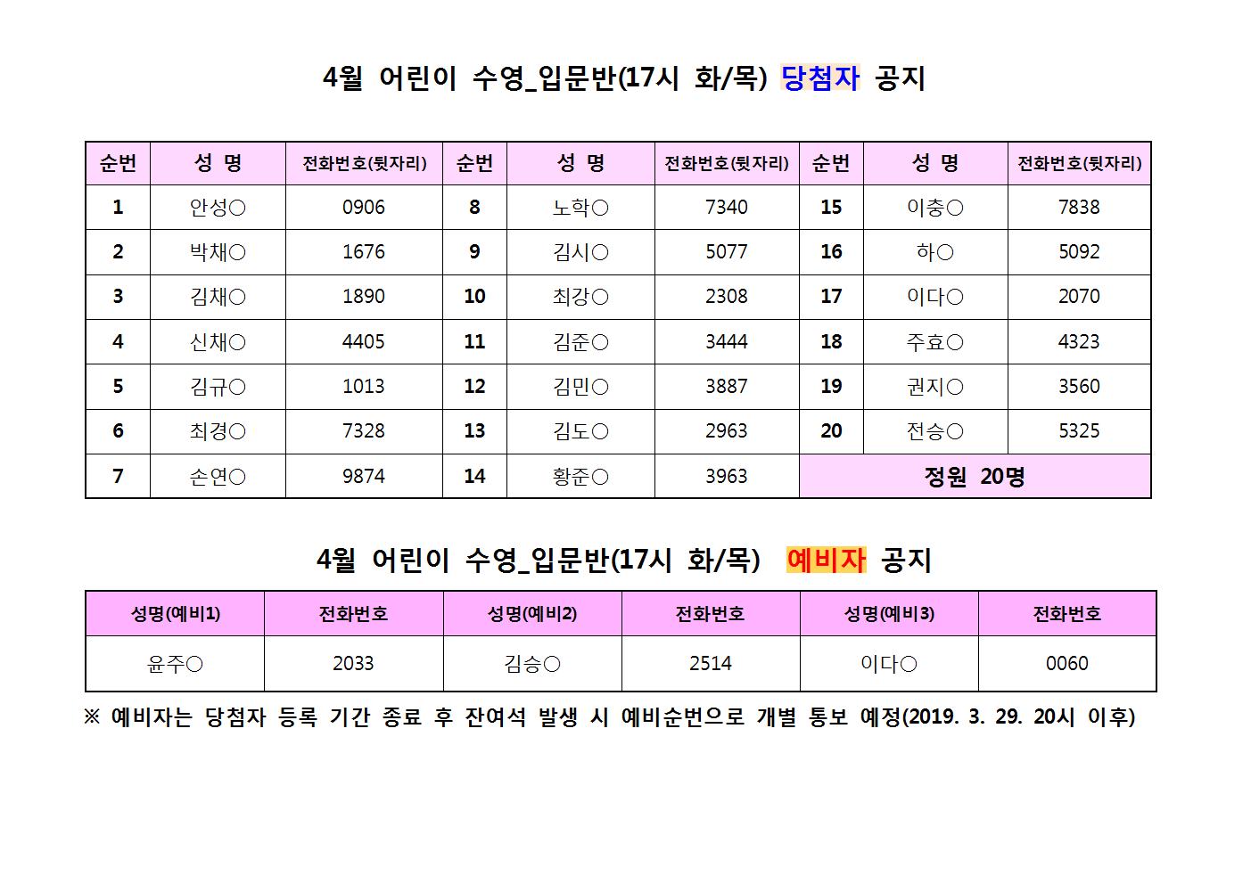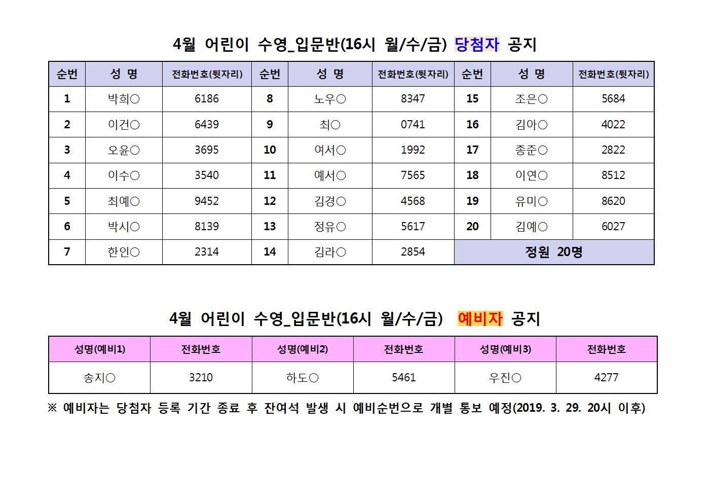 세교복지타운 수영장 4월 어린이 입문반 당첨자 작성자 세교센터관리자 등록일자 2019년 3월 27일 18시 51분 37초 조회 574 4월어린이16시(월,수,금)입문당첨자명단.jpg [ Size : 148.12KB , Down : 147 ] 미리보기 다운로드 4월당첨자 접수방법.jpg [ Size : 111.9KB , Down : 141 ] 미리보기 다운로드 4월어린이17시( 화,목)입문당첨자명단.jpg [ Size : 146.94KB , Down : 139 ] 미리보기 다운로드 목록보기