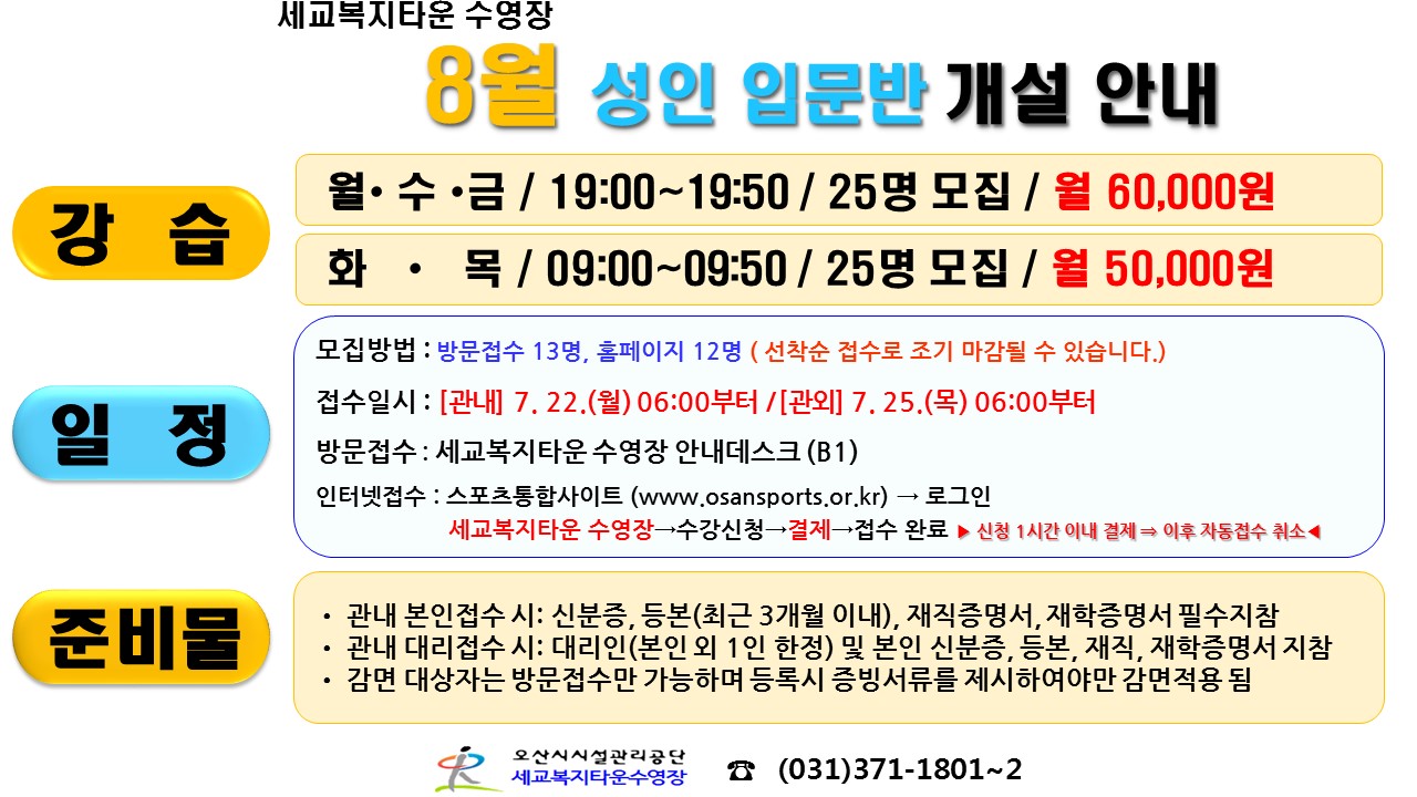 세교복지타운 수영장 8월 성인 입문반 개설 안내 작성자 세교센터관리자 등록일자 2019년 7월 16일 16시 23분 46초 조회 982 8월 성인 입문반 개설 안내.jpg [ Size : 227.52KB , Down : 120 ] 미리보기 다운로드 목록보기