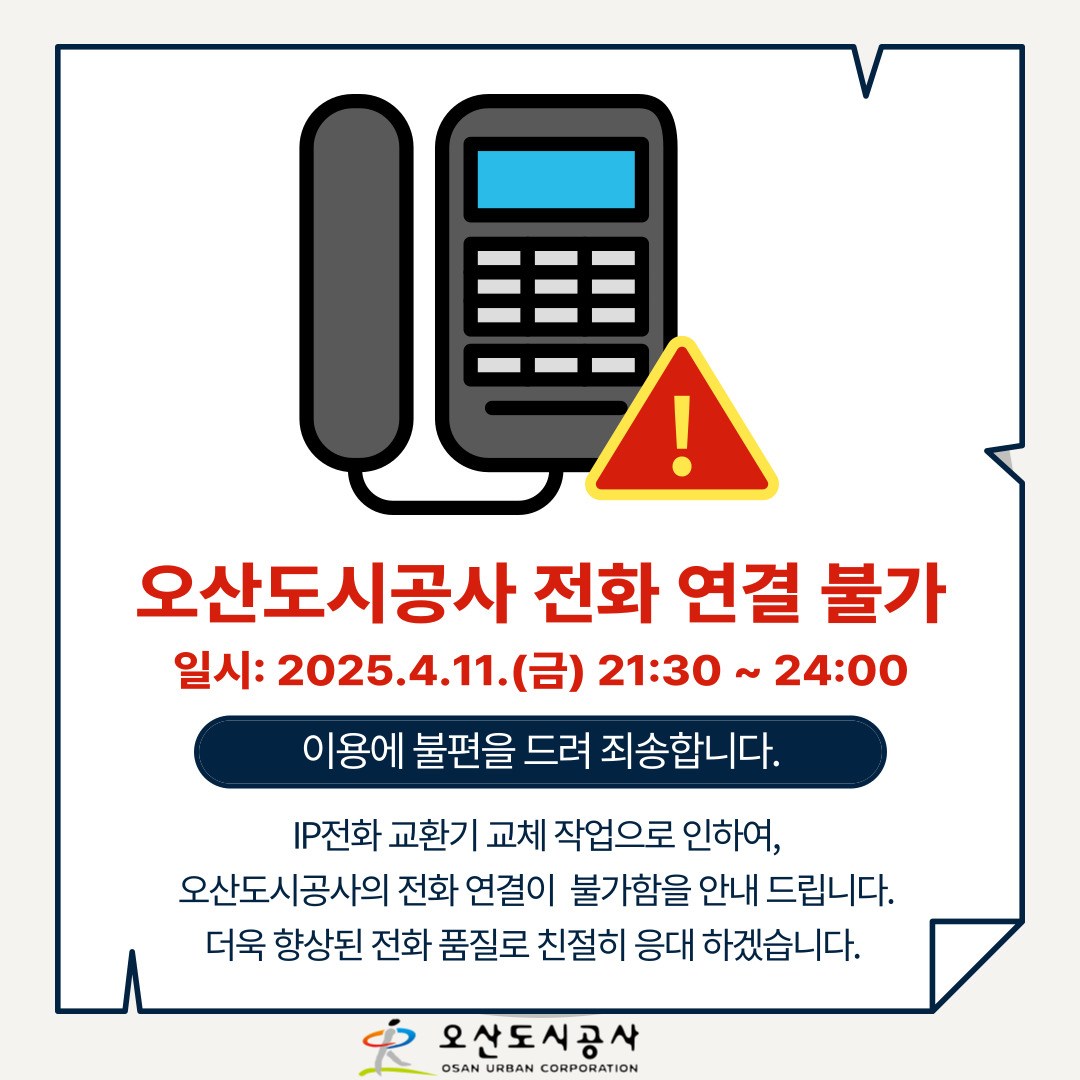 공통 오산도시공사 전화 연결 불가 안내 ☞ 4.11.(금), 21:30~24:00 작성자 osansisul02 등록일자 2025년 4월 2일 15시 12분 3초 조회 313 오산도시공사 전화 연결 불가 안내.jpg [ Size : 201.81KB , Down : 237 ] 미리보기 다운로드 목록보기