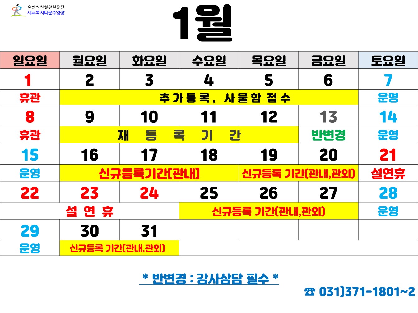 세교복지타운 수영장 1월 일정표(접수기간, 휴관일) 작성자 osansisul01 등록일자 2023년 1월 5일 18시 32분 14초 조회 379 1월 달력.jpg [ Size : 231.48KB , Down : 444 ] 미리보기 다운로드 목록보기