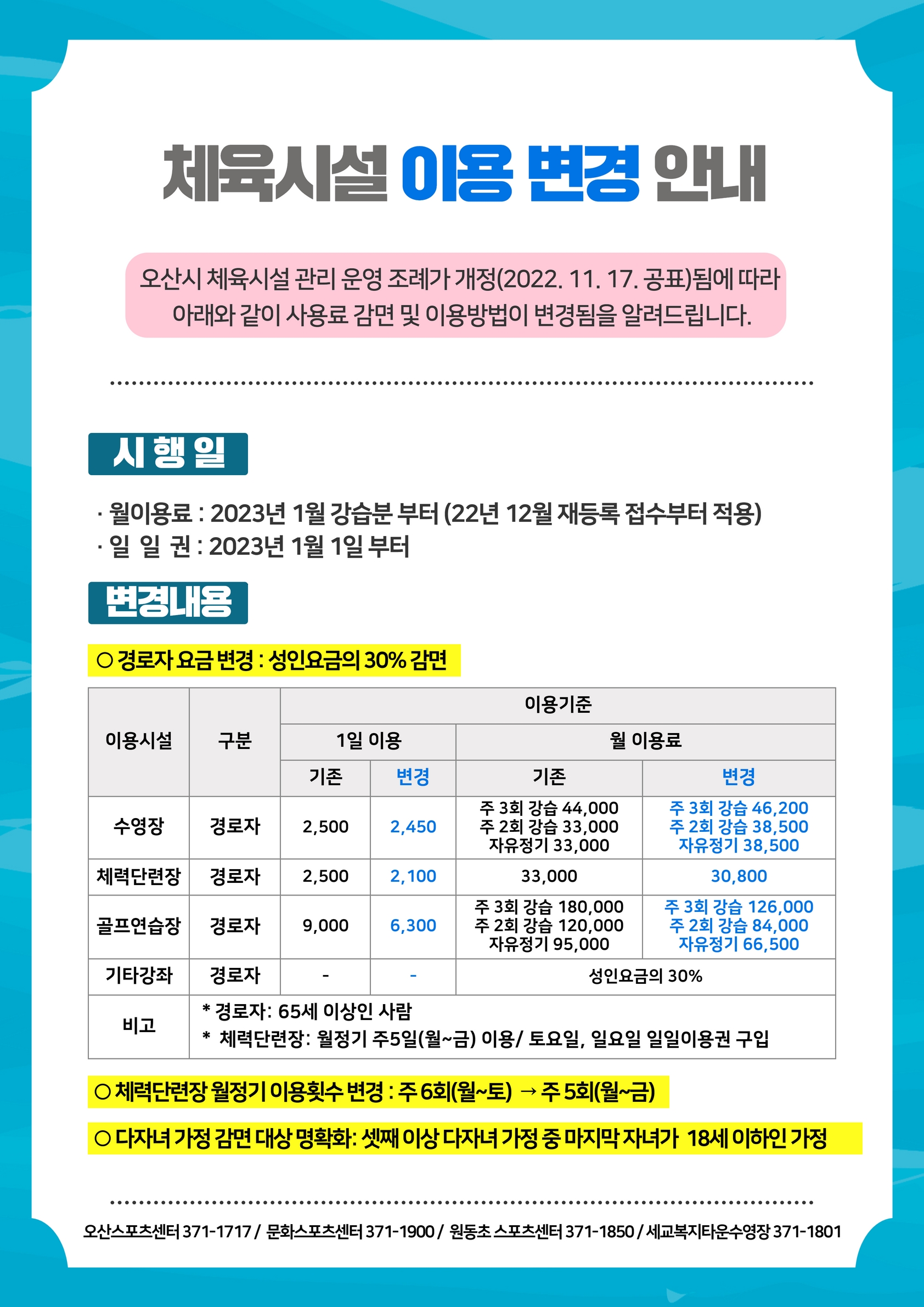 공통 체육시설 이용 변경 안내 작성자 osansisul03 등록일자 2022년 11월 14일 13시 47분 30초 조회 11,456 공지사항.jpg [ Size : 906.91KB , Down : 17,506 ] 미리보기 다운로드 목록보기