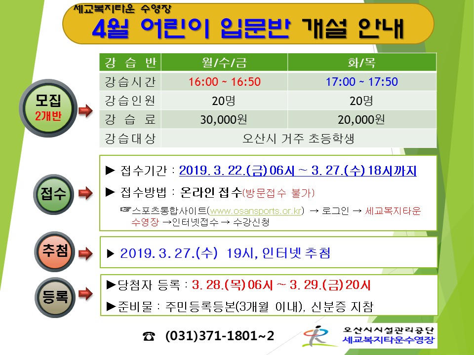 세교복지타운 수영장 4월 어린이 입문반 개설 안내(2개반 개설, 중복접수 불가) 작성자 세교센터관리자 등록일자 2019년 3월 19일 17시 23분 12초 조회 753 4월 어린이 입문반은 총 2개반이 개설되었습니다.중복 접수는 불가하오니 요일 및 시간 꼭 확인하신 후접수 진행하여 주시기 바랍니다. 기타 자세한 문의는 T: 031-371-1801~2 번으로 연락주시면 친절히 답변드리겠습니다. 감사합니다. 4월 어린이 입문반 개설 안내.jpg [ Size : 174.06KB , Down : 140 ] 미리보기 다운로드 목록보기