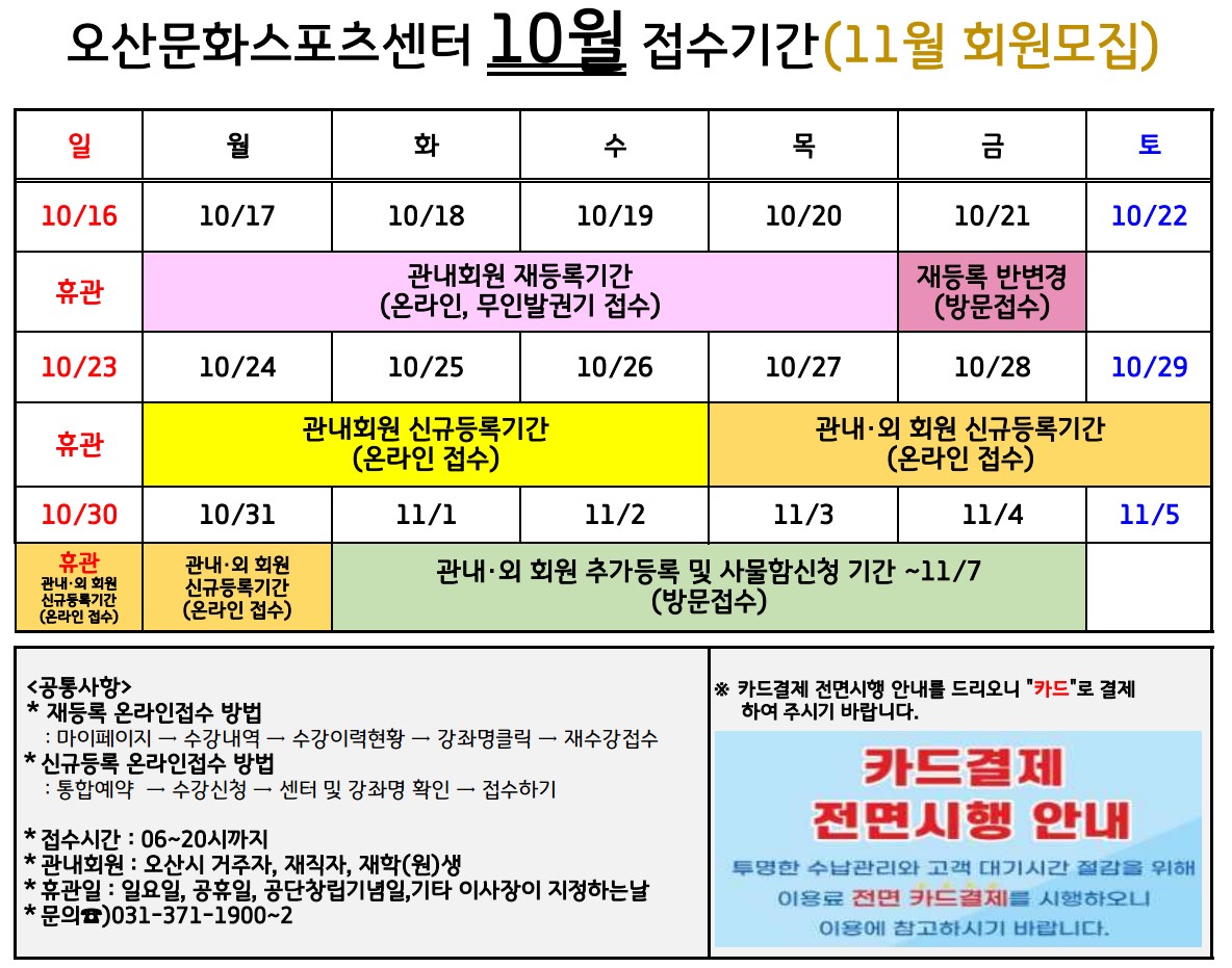 오색문화체육센터 오산문화스포츠센터 10월 접수기간(2022. 11월 강좌) 작성자 osansisul04 등록일자 2022년 10월 11일 18시 7분 13초 조회 505 . 10월회원모집(11월강좌).jpg [ Size : 251.88KB , Down : 968 ] 미리보기 다운로드 목록보기