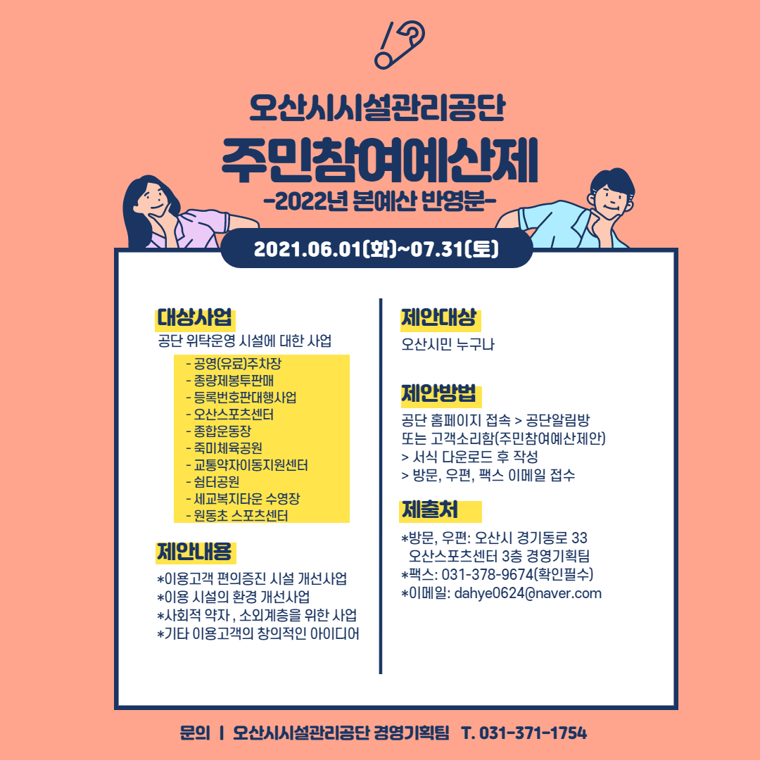 공통 오산시시설관리공단 주민참여 예산제 작성자 최고관리자 등록일자 2021년 6월 1일 16시 54분 20초 조회 556 홍보문(주민참여예산제).jpg [ Size : 539.7KB , Down : 188 ] 미리보기 다운로드 목록보기