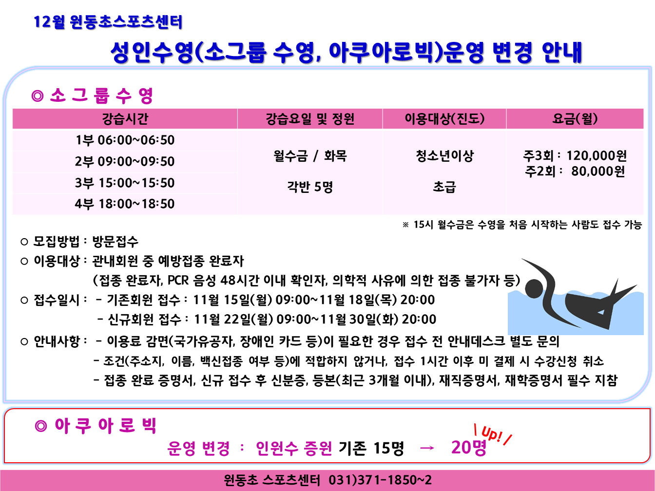 원동초 스포츠센터 12월 성인수영(소그룹수영, 아쿠아로빅) 운영 변경 안내 작성자 osansisul02 등록일자 2021년 11월 16일 14시 46분 51초 조회 1,299 성인수영 운영(12월).png [ Size : 199.54KB , Down : 224 ] 미리보기 다운로드 목록보기