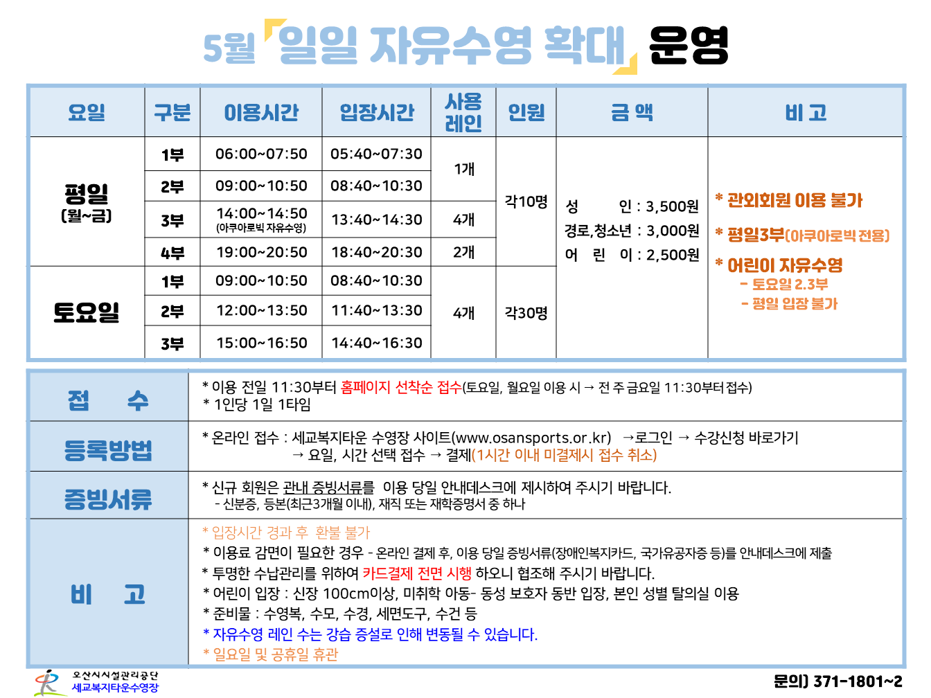 세교복지타운 수영장 5월 일일 자유수영 확대 운영 작성자 osansisul01 등록일자 2022년 4월 18일 10시 10분 19초 조회 572 자유수영 홍보물(22.05).png [ Size : 183.57KB , Down : 237 ] 미리보기 다운로드 목록보기