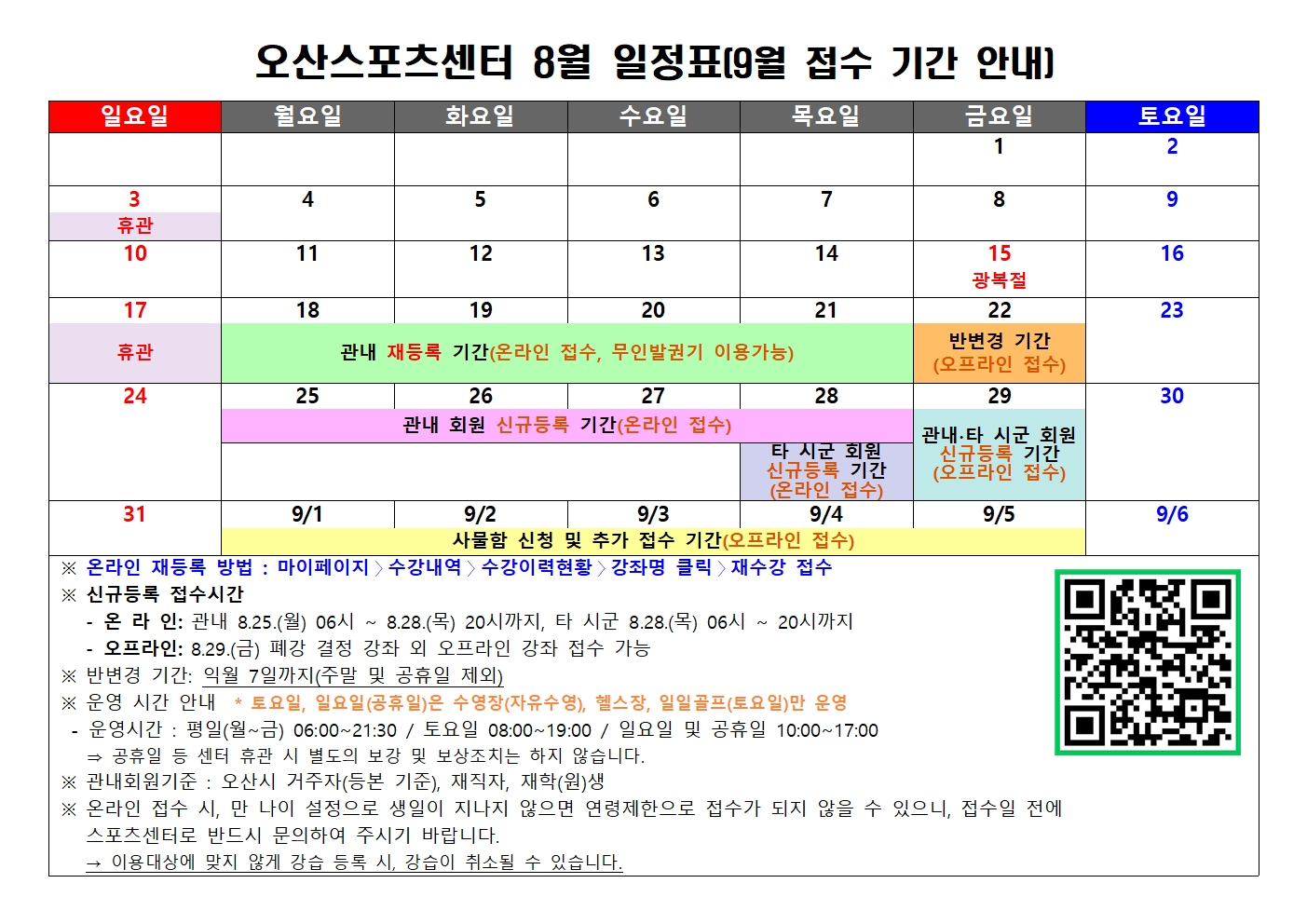 오산스포츠센터 [오산스포츠센터] 8월 일정표(9월 접수기간 안내) 작성자 osansisul03 등록일자 2025년 8월 14일 9시 13분 25초 조회 2,957 오산스포츠센터 8월 일정표(9월 접수 기간 안내)001.jpg [ Size : 625.26KB , Down : 4,454 ] 미리보기 다운로드 목록보기