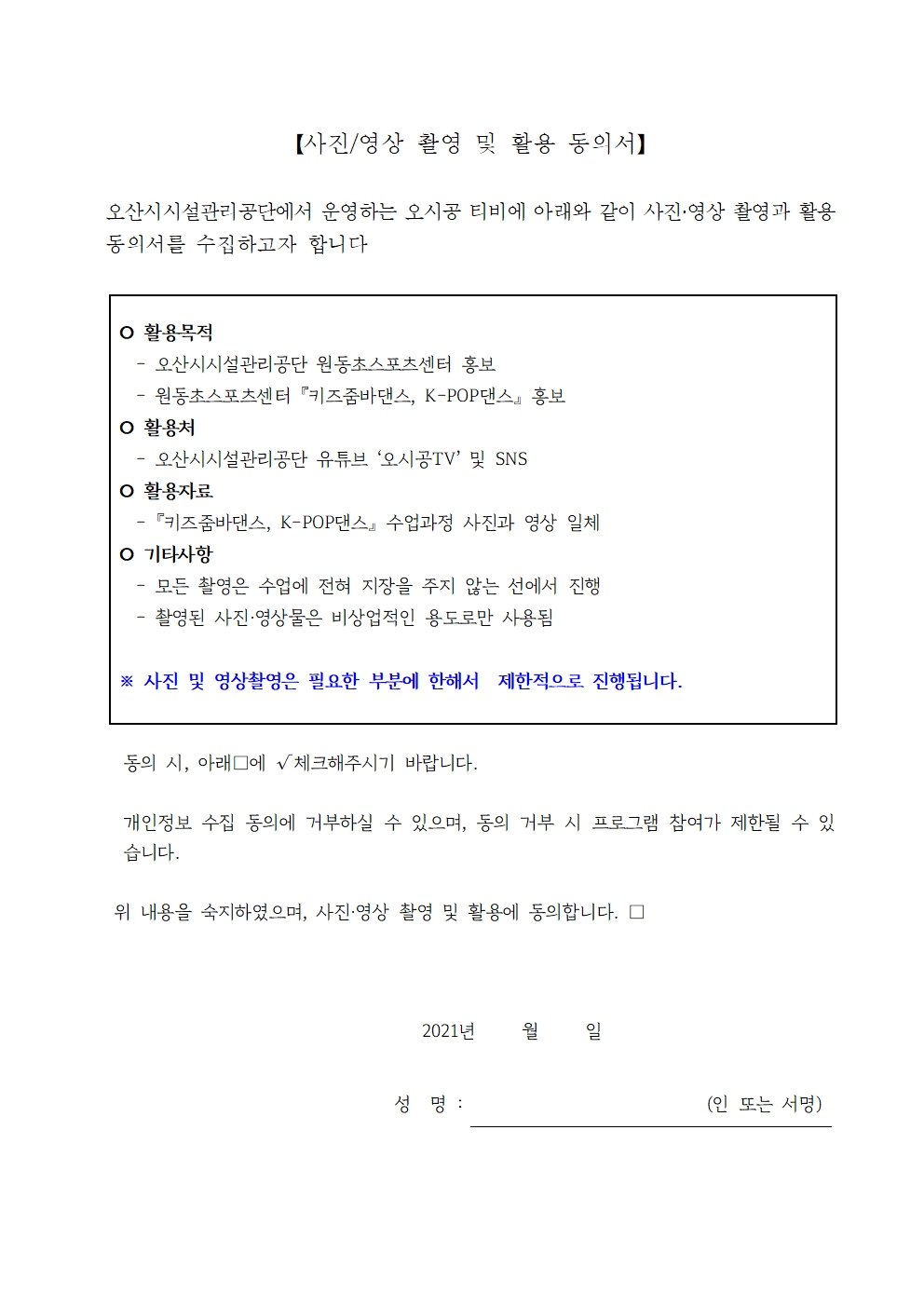 원동초 스포츠센터 키즈줌바댄스, K-POP댄스 사진/촬영 및 활용 동의서