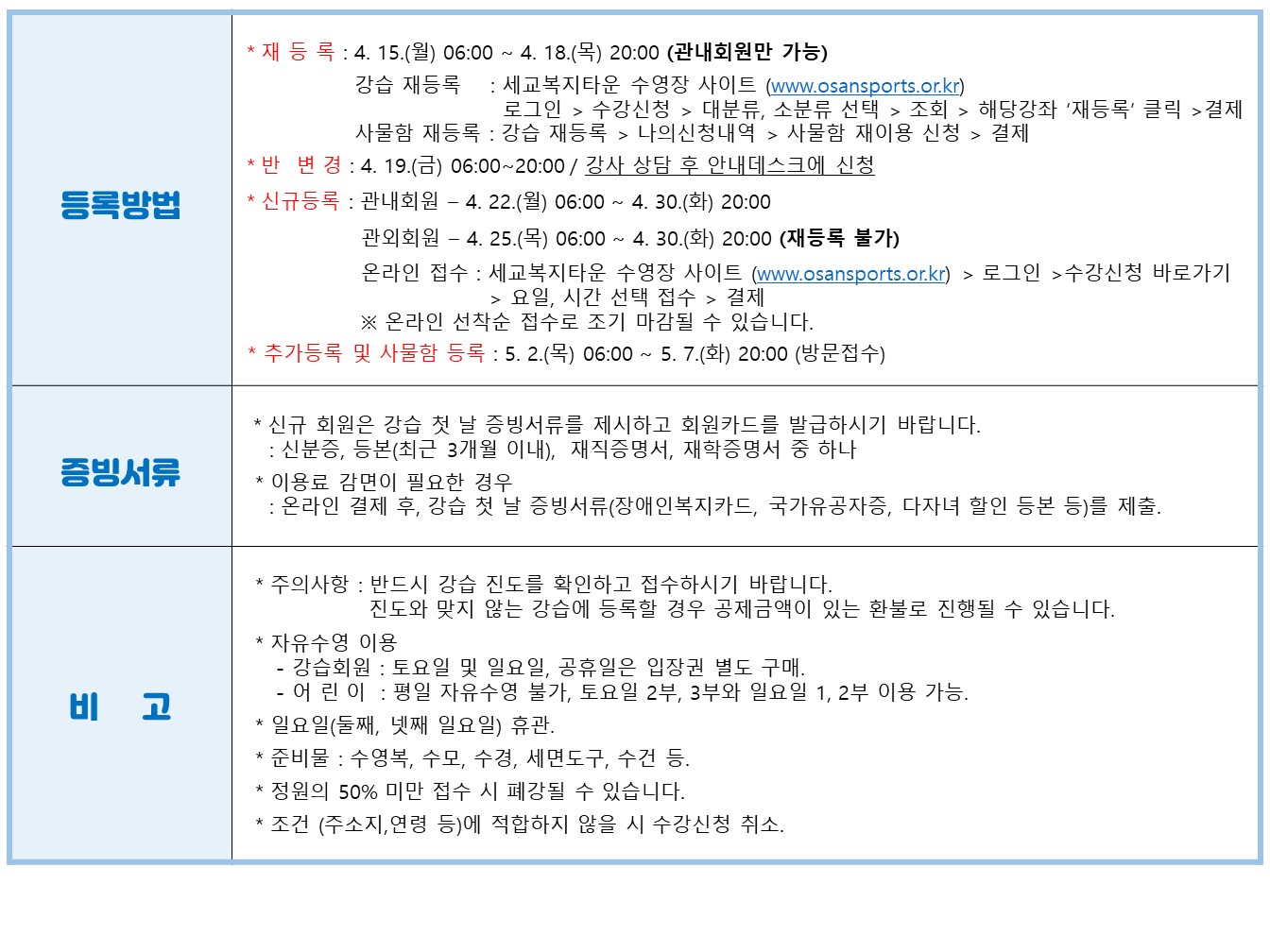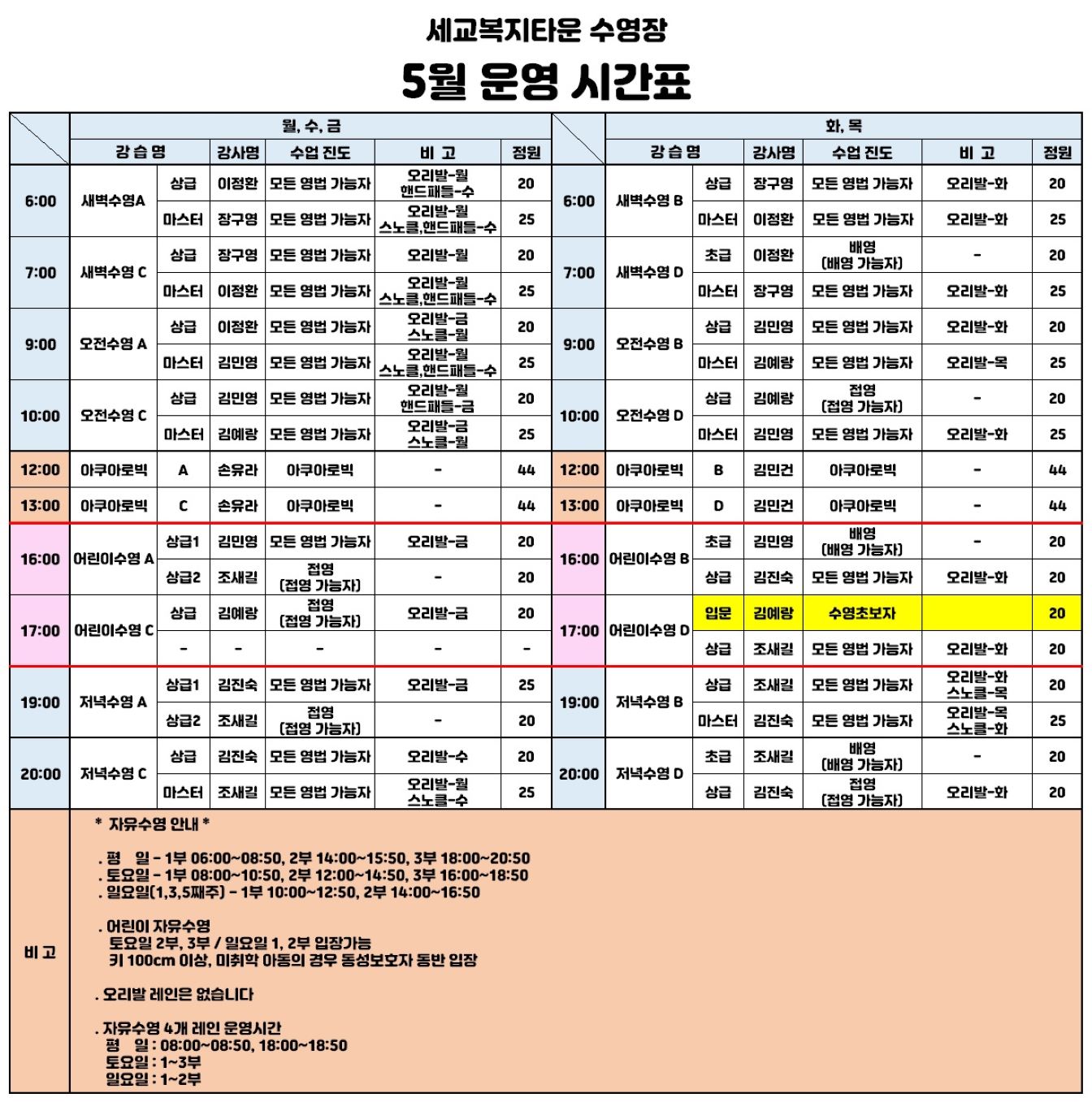 세교복지타운 수영장 [세교] 5월 강습진도표 작성자 osansisul01 등록일자 2024년 4월 12일 18시 47분 44초 조회 1,033 5월 운영시간표(홈페이지)2.jpg [ Size : 312.88KB , Down : 2,049 ] 미리보기 다운로드 24.5월 수영 접수 안내문(홈페이지).jpg [ Size : 253.38KB , Down : 1,878 ] 미리보기 다운로드 목록보기