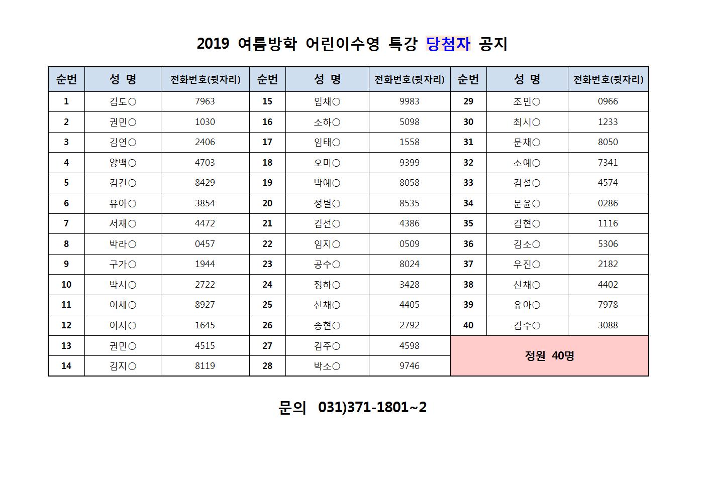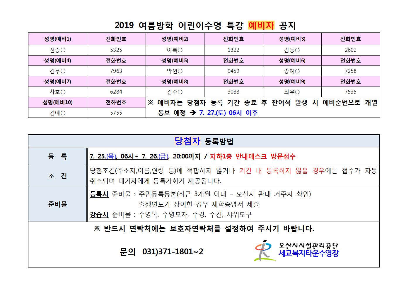 세교복지타운 수영장 2019 여름방학 어린이 특강 당첨자/예비자 공지 작성자 세교센터관리자 등록일자 2019년 7월 24일 18시 59분 12초 조회 577 여름방학 어린이수영 특강 당첨자명단001.jpg [ Size : 146.52KB , Down : 127 ] 미리보기 다운로드 여름방학 어린이수영 특강 당첨자명단002.jpg [ Size : 186.22KB , Down : 143 ] 미리보기 다운로드 목록보기