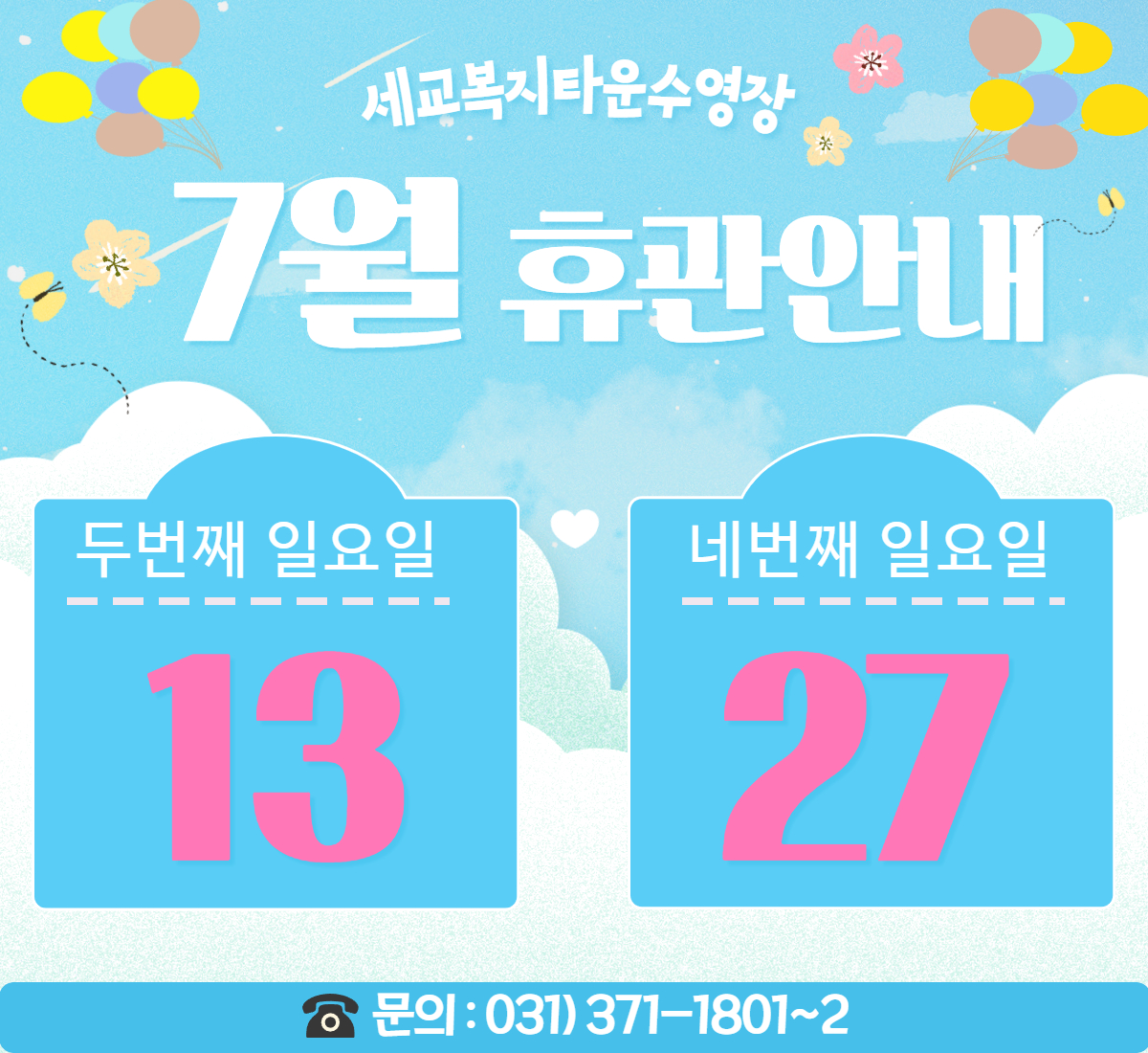 세교복지타운 수영장 [세교] 7월 휴관일 안내 작성자 osansisul01 등록일자 2025년 6월 26일 18시 45분 51초 조회 430 7월 휴관일.jpg [ Size : 1.14MB , Down : 417 ] 미리보기 다운로드 목록보기