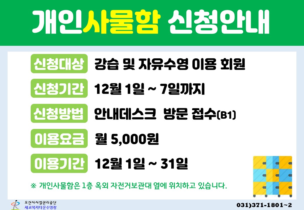세교복지타운 수영장 12월 개인사물함 신청 안내 작성자 osansisul01 등록일자 2023년 11월 29일 8시 18분 36초 조회 345 12월 개인사물함신청.JPG [ Size : 131.63KB , Down : 837 ] 미리보기 다운로드 목록보기