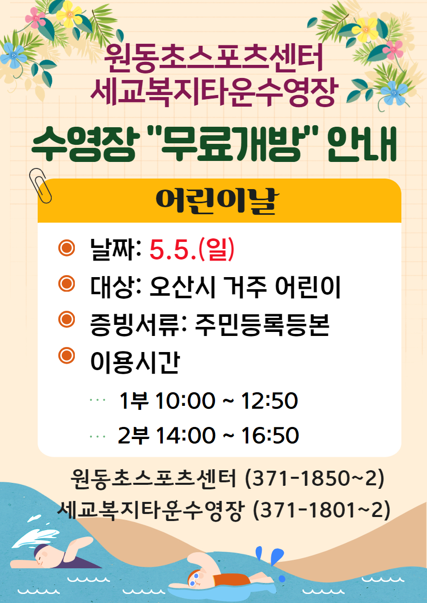 세교복지타운 수영장 [원동, 세교] 어린이날(5월 5일) 수영장 무료개방 안내 작성자 osansisul01 등록일자 2024년 5월 3일 14시 53분 52초 조회 778 어린이 무료개방.jpg [ Size : 651.6KB , Down : 836 ] 미리보기 다운로드 목록보기