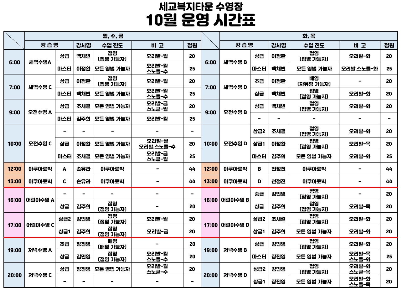 세교복지타운 수영장 [세교]10월 진도표(수정) 작성자 osansisul01 등록일자 2025년 9월 30일 9시 14분 28초 조회 731 수정내역: 강사 지정 10월 진도표(수정).jpg [ Size : 388.08KB , Down : 1,054 ] 미리보기 다운로드 목록보기