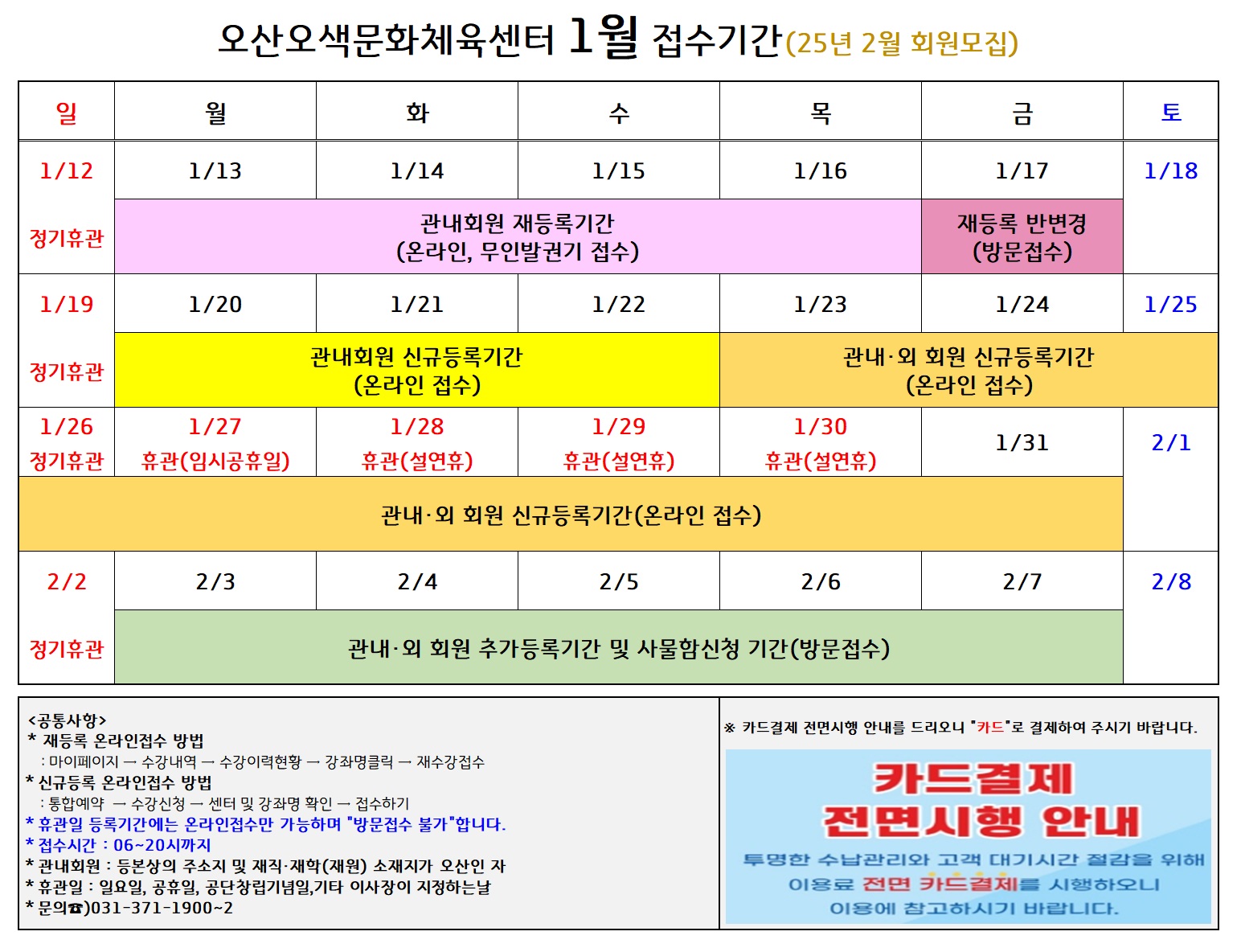 오색문화체육센터 [오색문화] 1월 접수기간(2025.2월 강좌) 작성자 osansisul04 등록일자 2025년 1월 8일 18시 30분 26초 조회 605 . [오색문화]1월 접수기간(2월강좌회원모집).jpg [ Size : 400.18KB , Down : 963 ] 미리보기 다운로드 목록보기