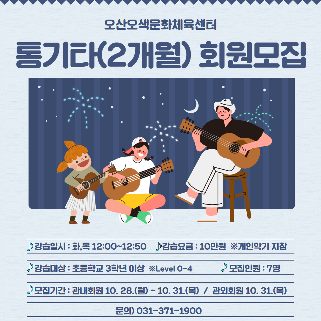 오색문화체육센터 [오색문화] 문화강좌(통기타) 추가회원 모집 안내 작성자 osansisul04 등록일자 2024년 10월 16일 13시 51분 5초 조회 1,248 [오색문화체육센터] 문화강좌(통기타) 추가회원 모집 안내]가을하늘아래 모닥불곁에서 제일 필요한건 뭐다? 통.기.타. 👏👏👏통기타 추가 회원모집도 실시(문화강의실A 에서 운영)하오니 모집기간내 꼭 등록부탁드려요😊 . 통기타D.jpg [ Size : 778.45KB , Down : 1,478 ] 미리보기 다운로드 목록보기