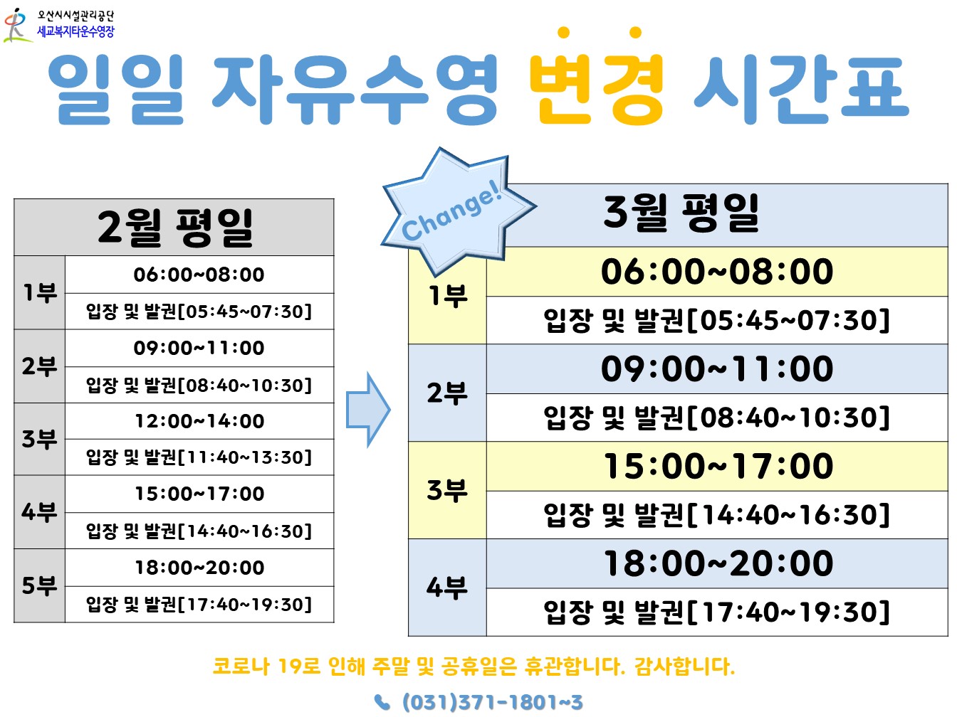 세교복지타운 수영장 3월 일일 자유수영 시간표 작성자 세교센터관리자 등록일자 2021년 2월 25일 21시 32분 22초 조회 719 2021 자유수영 변경 시간표.jpg [ Size : 245.18KB , Down : 154 ] 미리보기 다운로드 목록보기