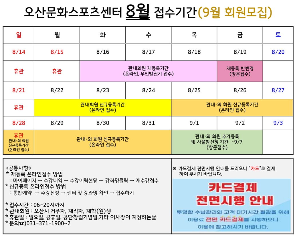 오색문화체육센터 오산문화스포츠센터 8월 접수기간(2022. 9월 강좌) 작성자 osansisul04 등록일자 2022년 8월 10일 15시 8분 43초 조회 829 . 8월접수기간(9월회원모집).jpg [ Size : 365.59KB , Down : 1,555 ] 미리보기 다운로드 목록보기