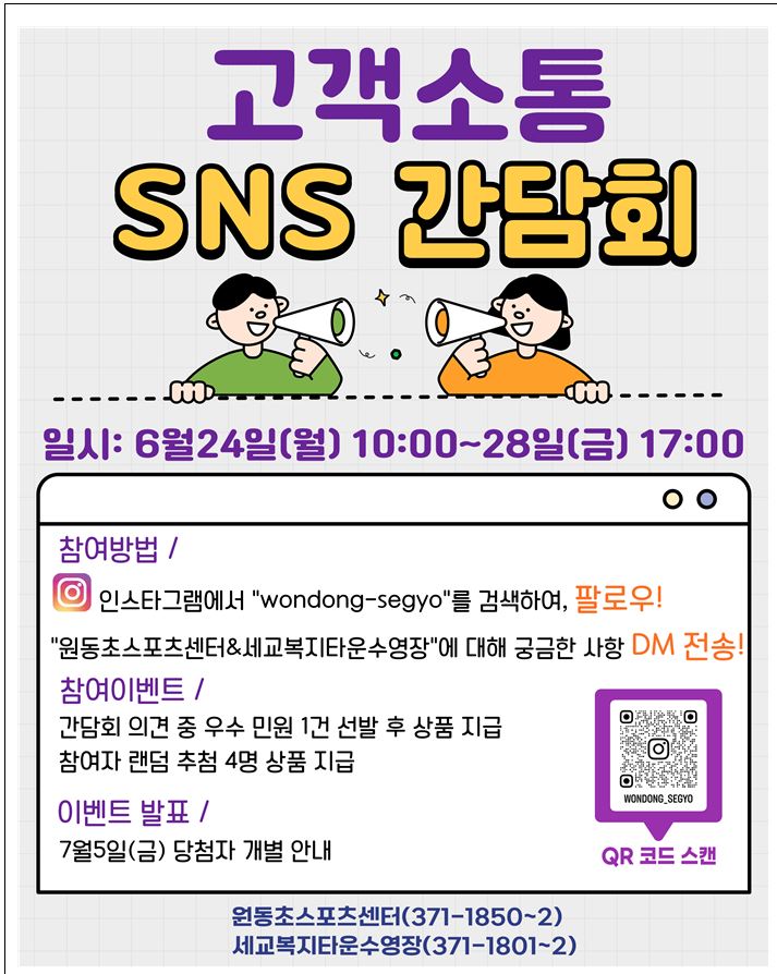 원동초스포츠센터와 세교복지타운수영장을 이용하는 고객 대상 SNS 소통 간담회가 오늘부터 28일 금요일까지 진행됩니다.
