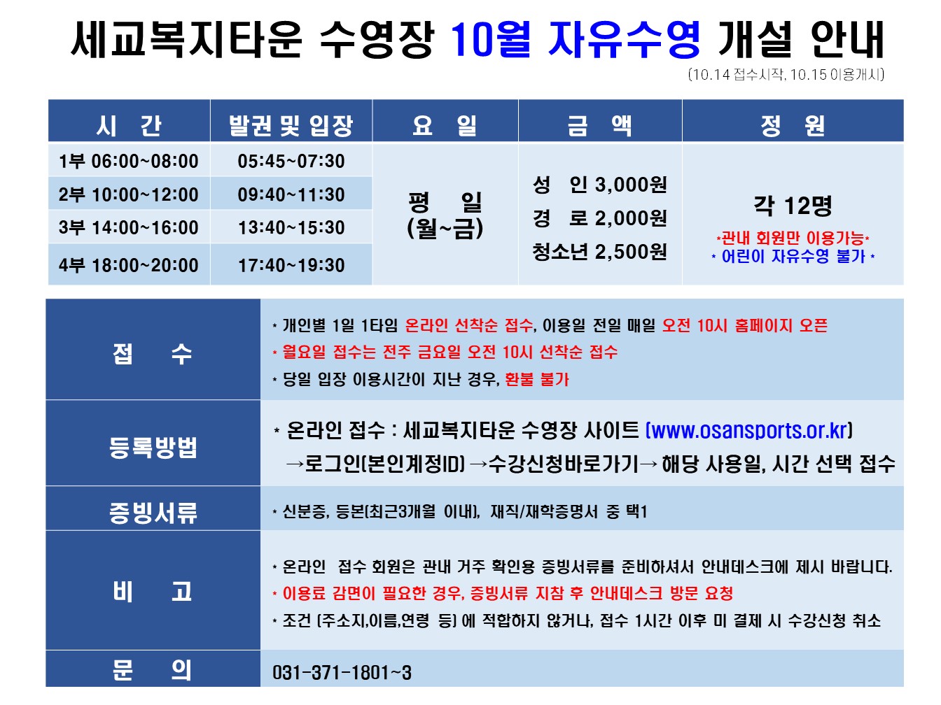 세교복지타운 수영장 세교복지타운 수영장 10월 자유수영 개설 안내 작성자 세교센터관리자 등록일자 2020년 10월 15일 6시 46분 32초 조회 786 2020년 10월 자유수영 개설.jpg [ Size : 265.12KB , Down : 137 ] 미리보기 다운로드 목록보기